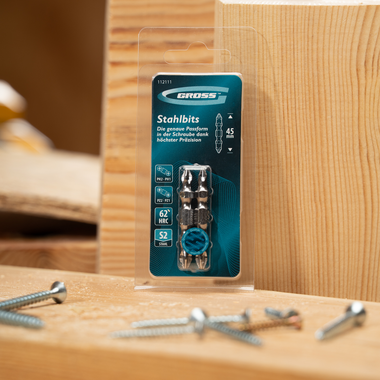 Набор двусторонних бит Gross 112111 состоит из насадок PH2-PH1 х 45 мм и PZ2-PZ1 х 45 мм, изготовленных из стали S2. Предназначен для закручивания/откручивания саморезов по дереву и другого резьбового крепежа с помощью шуруповерта. Насадки с рабочими профилями самого востребованного типа Phillips и Pozidriv подходят как для бытового, так и для профессионального использования. Дополнительные ребра в шлице PZ обеспечивают максимально плотное прилегание биты к шляпке метиза.