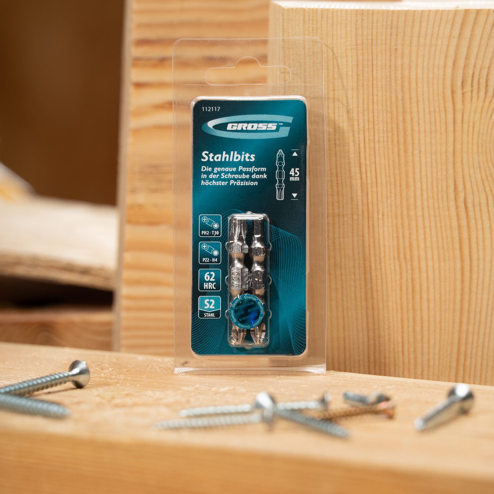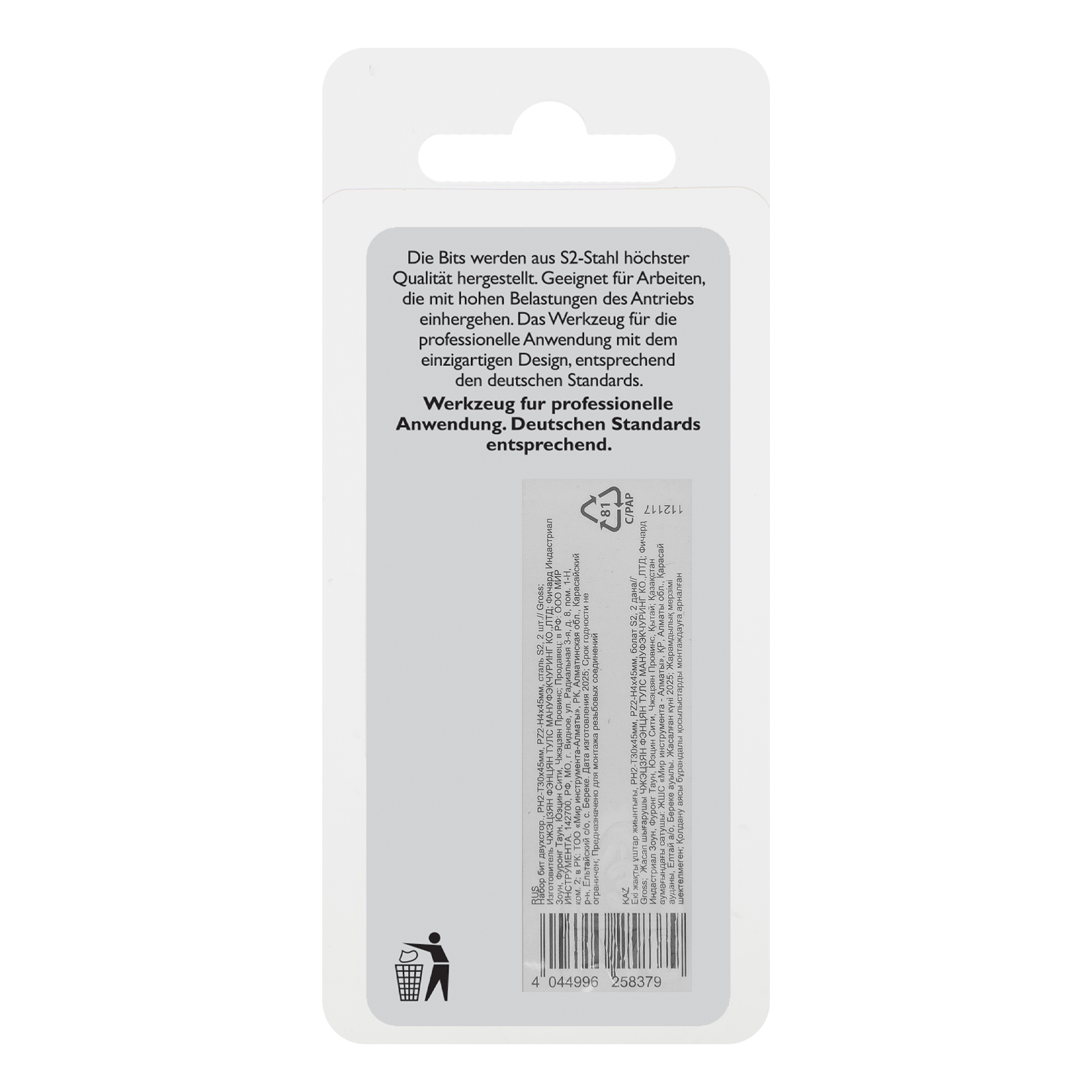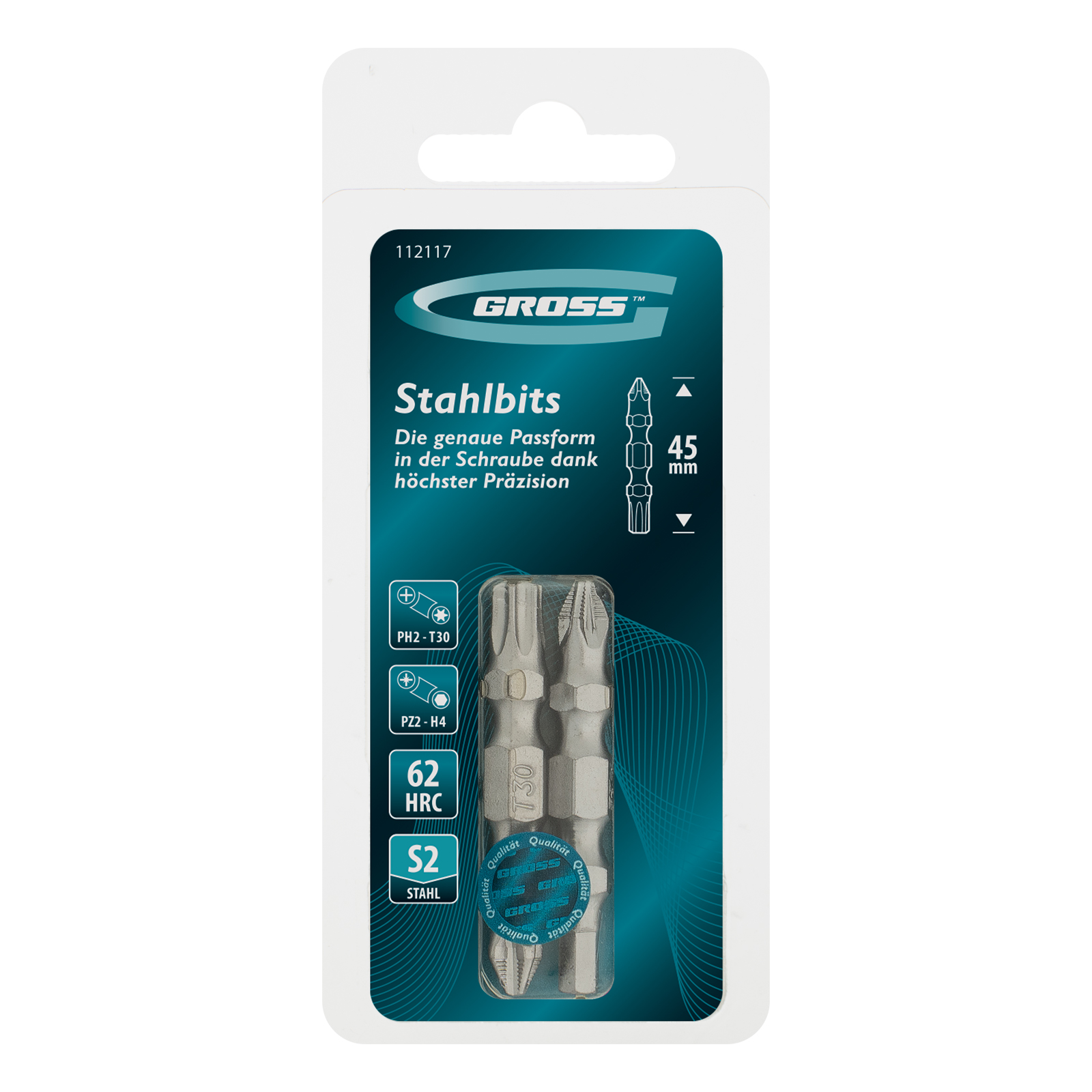Набор двусторонних бит Gross 112117 состоит из насадок PH2-T30 х 45 мм и PZ2-H4 х 45 мм, изготовленных из стали S2. Предназначен для закручивания/откручивания саморезов по дереву и другого резьбового крепежа с помощью шуруповерта. Насадки подходят как для бытового, так и для профессионального использования. Дополнительные ребра в шлице PZ обеспечивают максимально плотное прилегание биты к шляпке метиза.