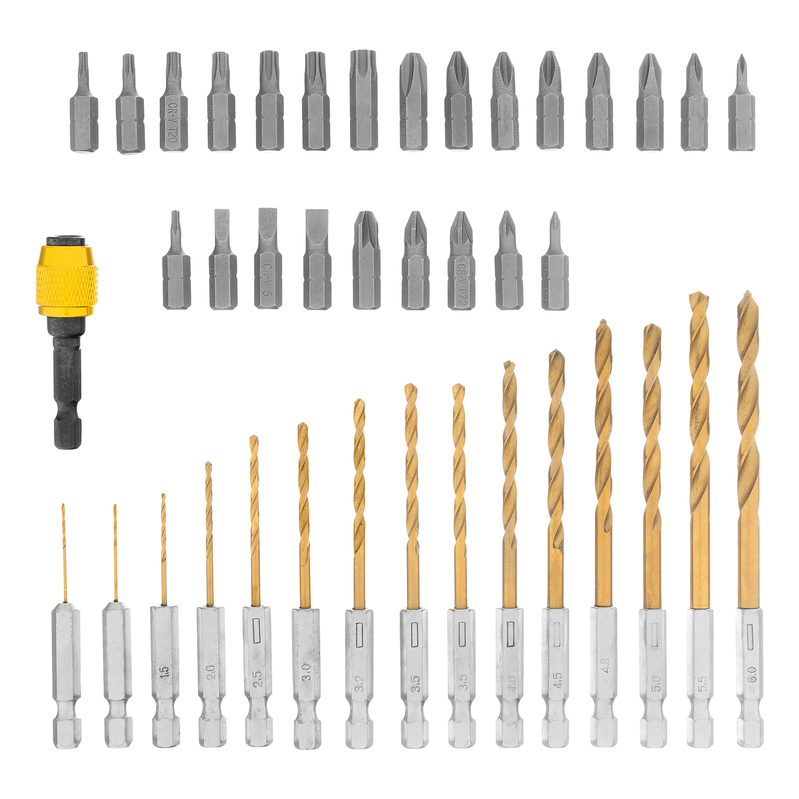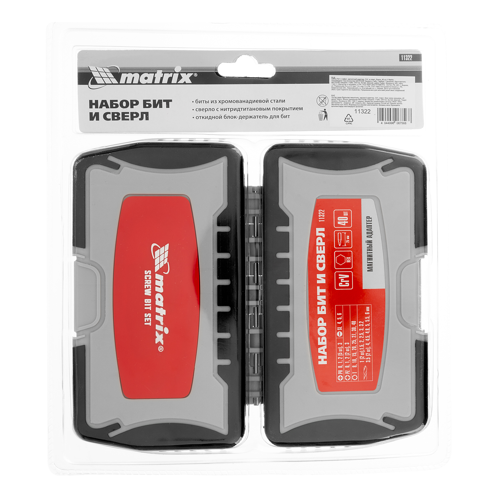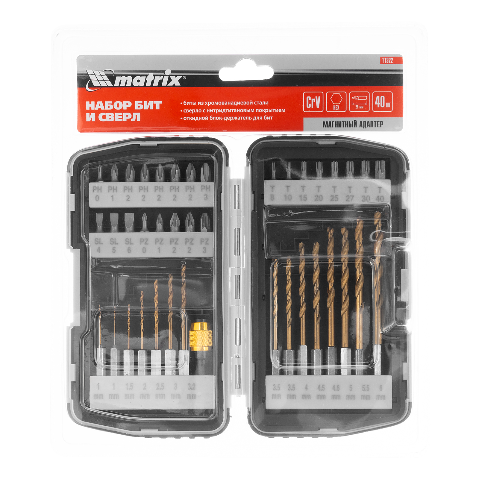 Набор Matrix 11322, упакованный в пластиковый бокс, состоит из 40 предметов: бит из стали CrV и сверл с посадочным размером 1/4 дюйма, а также магнитного адаптера. Предназначен для работы с шуруповертами и подходит для решения широкого спектра задач, т.к. включает 24 биты (PH и PZ № 0-3, SL № 4-6, T № 8, 10, 15, 20, 25, 27, 30, 40) и 15 сверл диаметром 1-6 мм. Оснастки применяются для монтажа шурупов и саморезов, а также для сверления отверстий в металле.