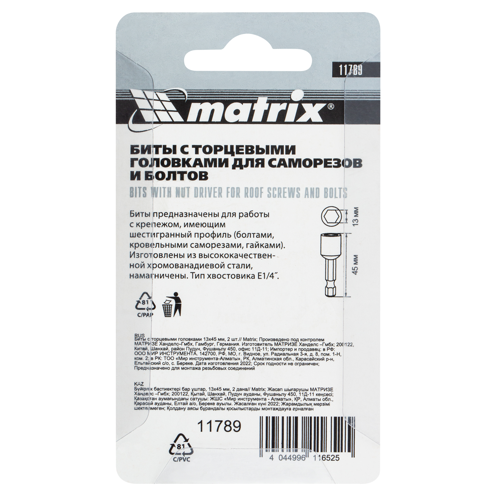 Биты с торцевыми головками Matrix 11789 размером 13 х 45 мм, 2 шт. в уп., предназначены для работ с шуруповертом. Используются при монтаже и демонтаже болтов и шурупов, а также кровельных саморезов с внешним шестигранником. Увеличенная длина 45 мм облегчает работу в труднодоступных местах. Биты способны полностью заменить торцевые головки, особенно если под рукой нет трещотки.