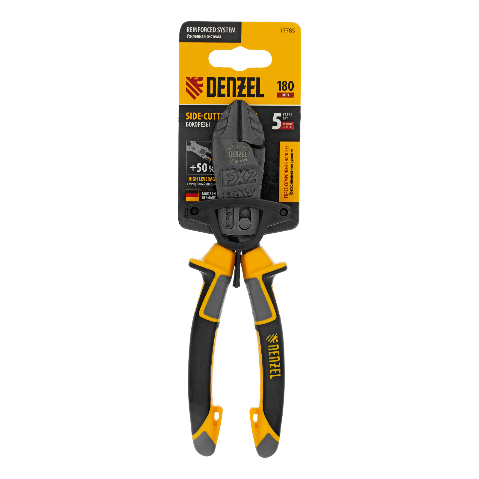Усиленные бокорезы Denzel 17785 длиной 180 мм, с трехкомпонентными рукоятками, предназначены для разрезания кабелей, проводов, гвоздей и проволоки средней (750 Н/мм2) и высокой жесткости (1800 Н/мм2) диаметром 4 и 2,8 мм соответственно. Подходят для резки рояльных струн (предел прочности 2300 Н/мм2) диаметром до 2,5 мм. Успешно справляются не только с медными, алюминиевыми и пластмассовыми деталями, но и с более жесткими стальными элементами. Встроенный рычажный механизм и смещенный непосредственно к режущим кромкам шарнир увеличивают усилие реза на 50%.