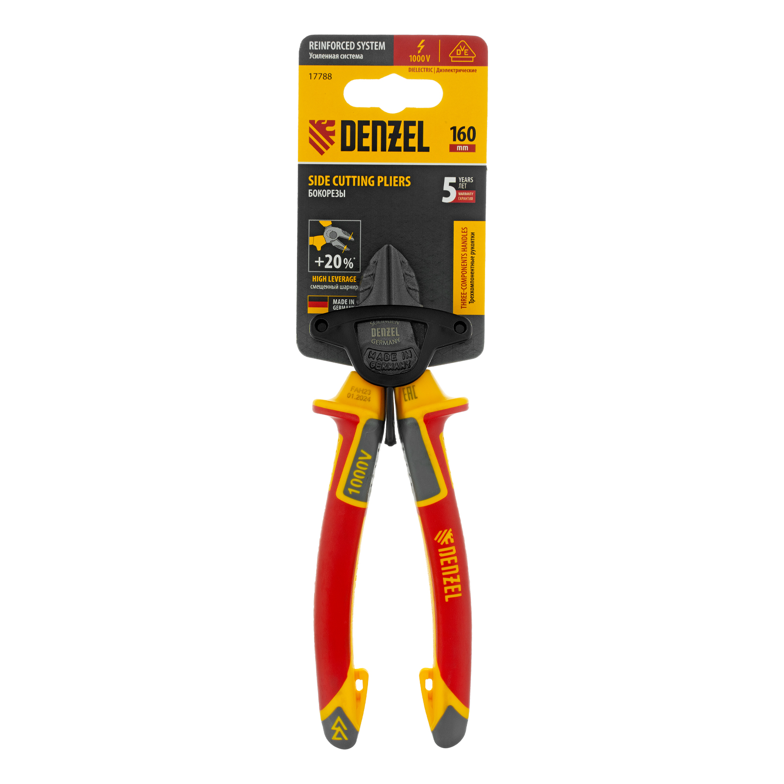 Бокорезы Denzel 17788 длиной 160 мм, с трехкомпонентными диэлектрическими рукоятками, рассчитанными на напряжение до 1000 В, предназначены для разрезания кабелей, проводов, проволоки, стержней из пластмассы и металла. Максимальный диаметр перерезаемой мягкой проволоки (алюминиевой, медной, с пределом прочности 220 Н/мм2) составляет 6 мм, проволоки средней жесткости и гвоздей (750 Н/мм2) — 3,5 мм, жесткой (1800 Н/мм2) — 2 мм. Бокорезы подходят для проведения электромонтажных работ. Инструмент эффективно справляется с поставленными задачами благодаря шарниру, смещенному к режущим кромкам и увеличивающему усилие реза на 20%.