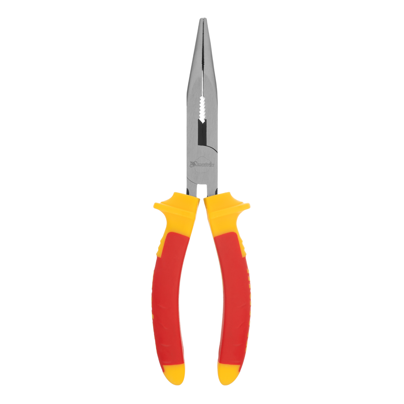 Изогнутые длинногубцы Matrix Insulated 17474 длиной 200 мм, с двухкомпонентными рукоятками, облегчают работу в труднодоступных местах. Они пригодятся не только ремонтникам и слесарям, но и электромонтажникам, т.к. рукоятки обладают диэлектрическими свойствами и рассчитаны на напряжение до 1000 В. Важно — техника безопасности запрещает выполнять работы под напряжением!