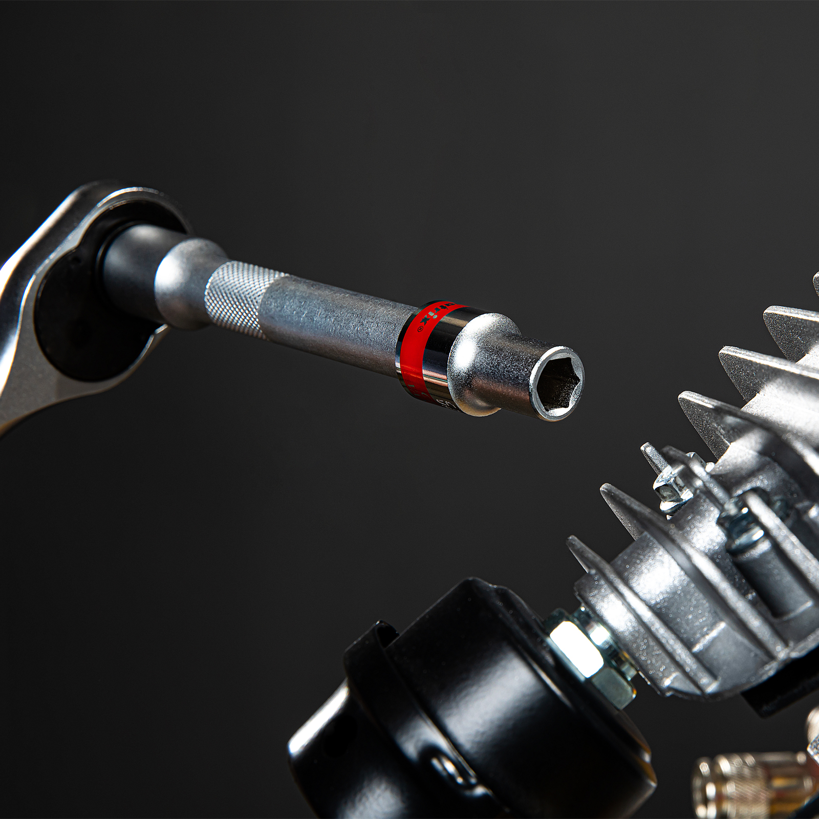 - Быстрый поиск насадки среди других инструментов — торцевая головка маркирована красной полосой, на корпус нанесено обозначение типоразмера.