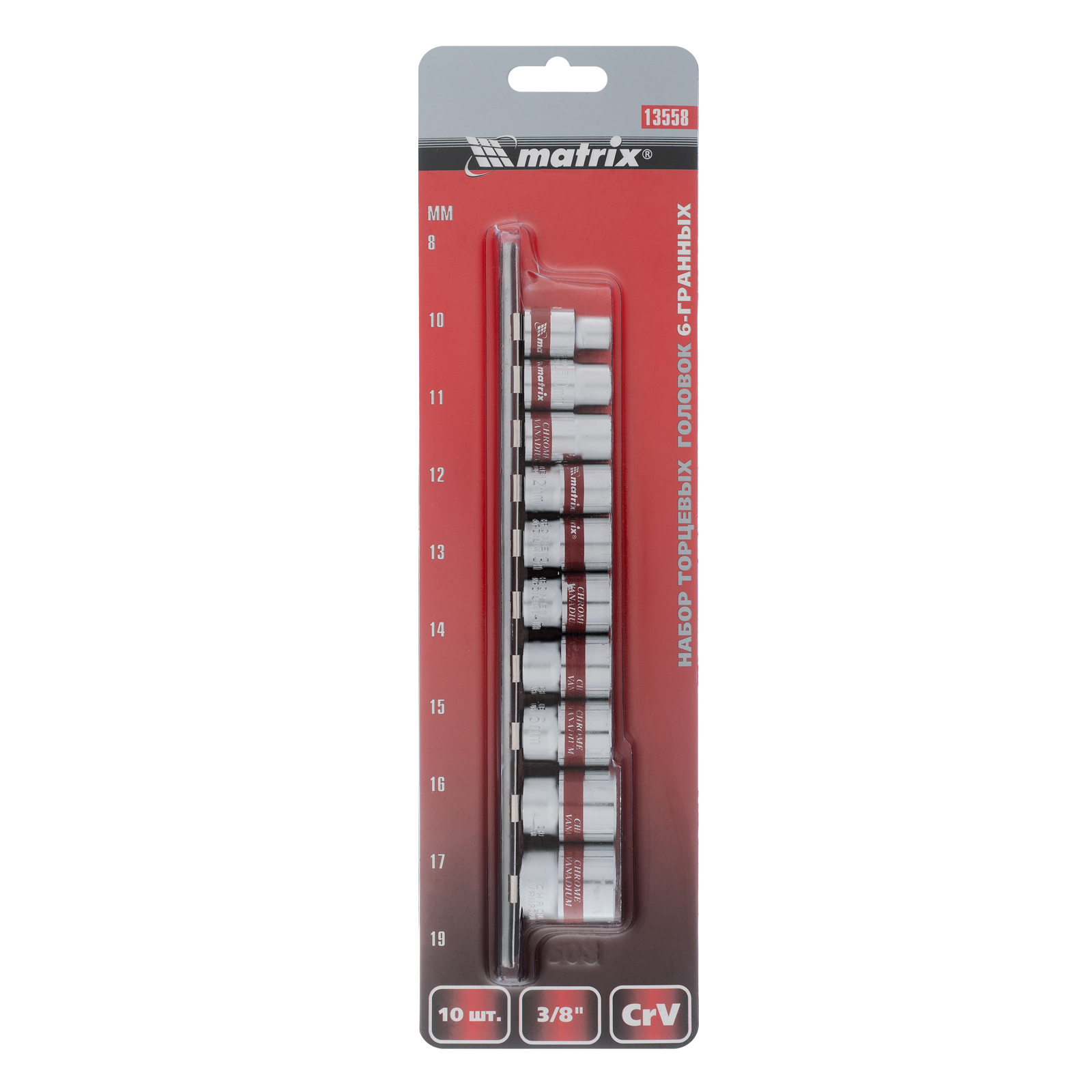 Набор торцевых головок Matrix 13558 из стали CrV, с посадочным гнездом 3/8" и шестигранным профилем, включает 10 насадок диаметром 8-19 мм, предназначенных для работы с резьбовыми соединениями. Пригодится для проведения бытового ремонта, будет полезен сантехнику, слесарю, авторемонтнику.