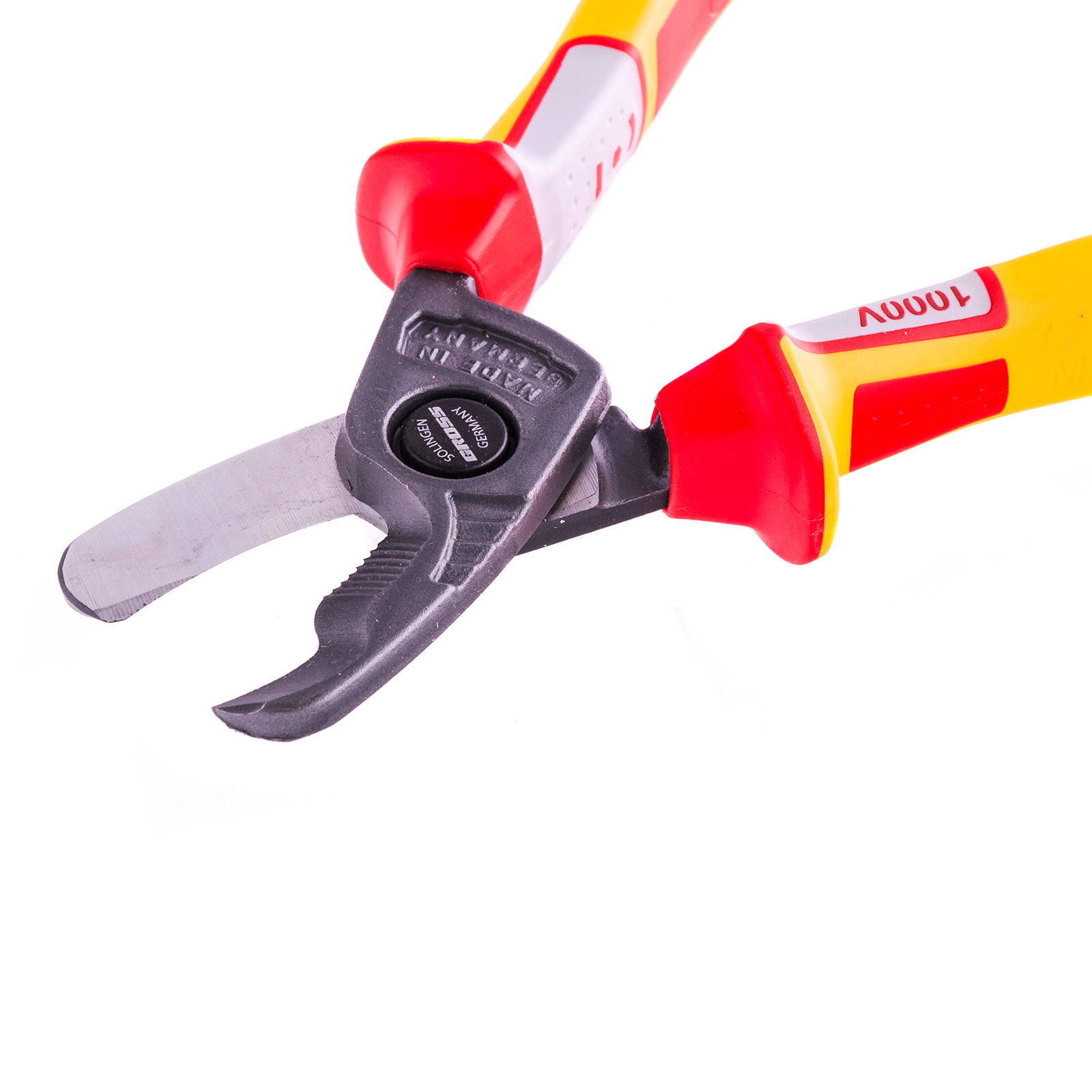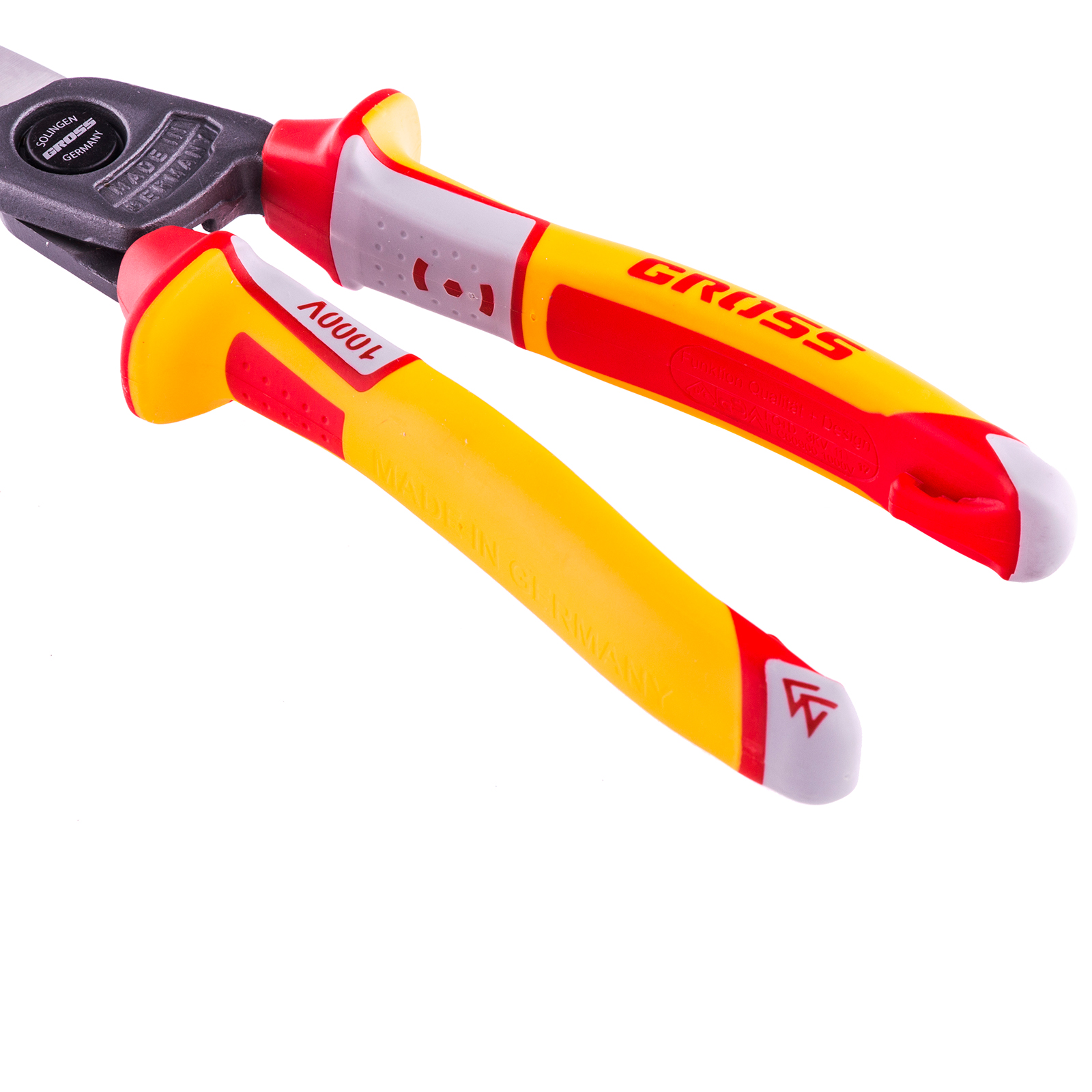 Кабелерез Gross 17728 длиной 210 мм, с диалектическими рукоятками до 1000 В, широко используется при проведении слесарных и электромонтажных работ. С его помощью можно перерезать многопроволочную жилу из меди и алюминия, снять изоляцию с электропроводов. Важно — работа под напряжением не допускается, инструмент не подходит для работы с алюминиевыми сплавами, стальной проволокой и холоднотянутыми медными проводами, может использоваться только для многопроволочных жил (общий диаметр кабеля не более 25 мм, сечение до 70 мм2).