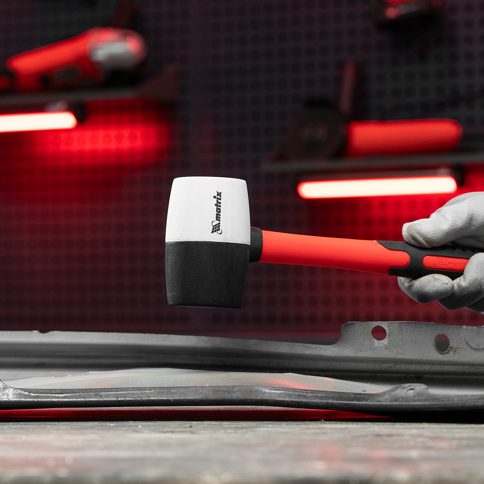 Резиновая киянка Matrix 11171 из черно-белой резины, с фибергласовой рукояткой и бойком весом 450 г, применяется при проведении монтажных, сборочных и кузовных работ, для укладки плитки. Инструмент обладает высоким показателем прочности, стойкостью к воздействию внешней агрессивной среды и хорошим вибропоглощением, поэтому подходит для профессионального применения.