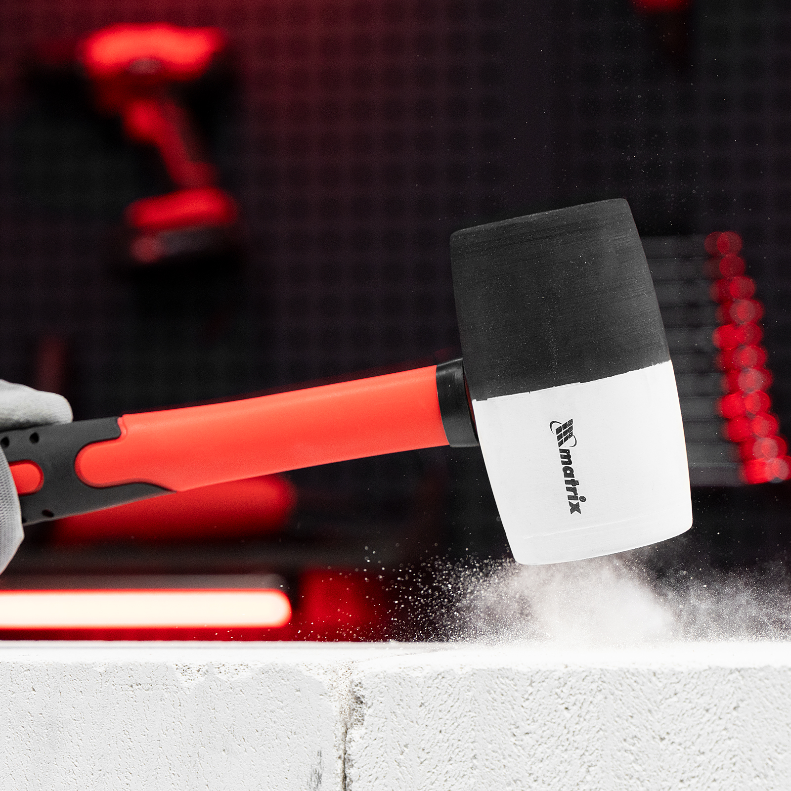 Резиновая киянка Matrix 11172 из черно-белой резины, с фибергласовой рукояткой и бойком весом 680 г, применяется при проведении монтажных, сборочных и кузовных работ, для укладки плитки. Инструмент обладает высоким показателем прочности, стойкостью к воздействию внешней агрессивной среды и хорошим вибропоглощением, поэтому подходит для профессионального применения.