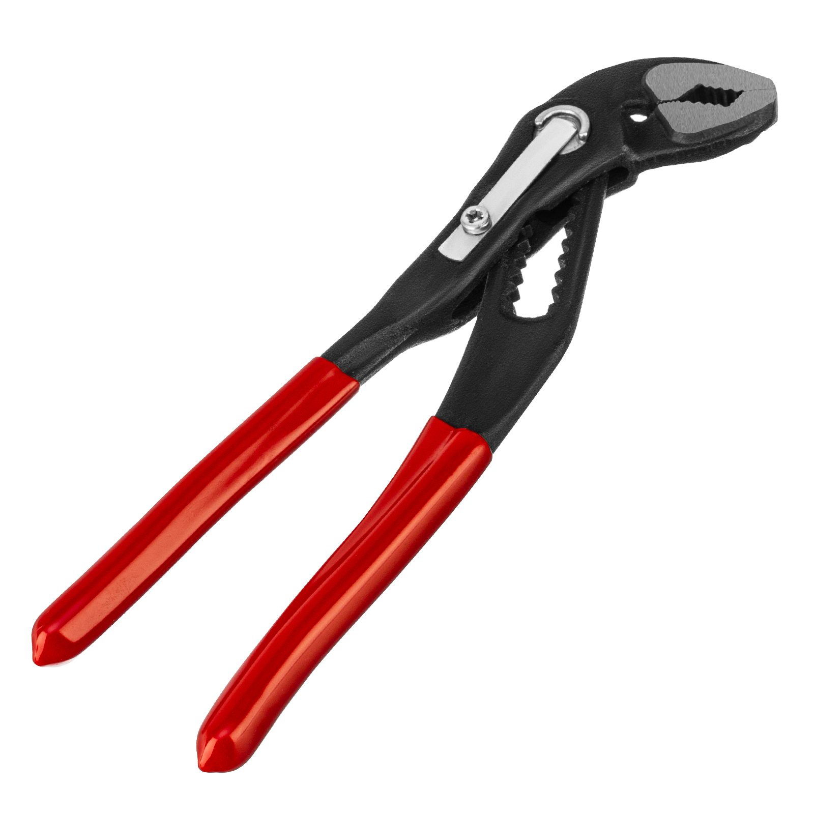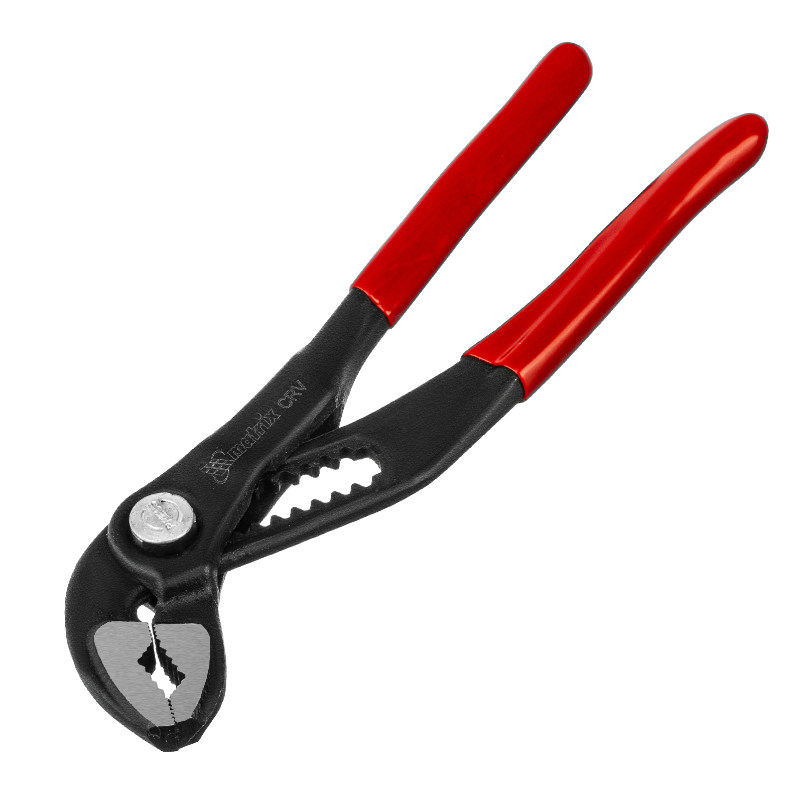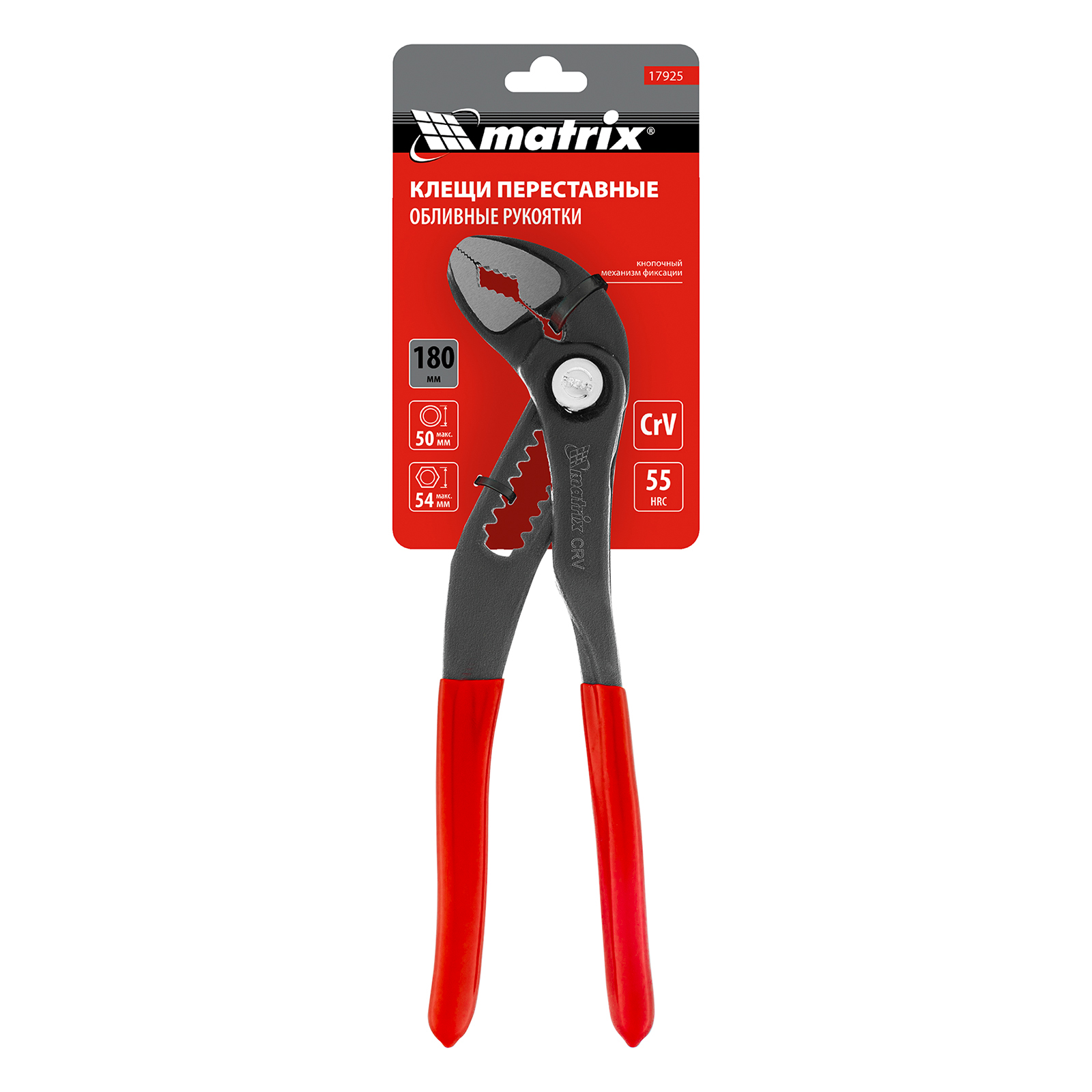 Переставные клещи Matrix 17925 длиной 180 мм, выполненные из хромованадиевой стали, с кнопочным механизмом и обливными рукоятками, используются для проведения монтажных и слесарных работ. Универсальный инструмент заменяет ключи различных размеров и применяется для фиксации заготовок, откручивания гаек, зажима и удержания труб диаметром до 50 мм.