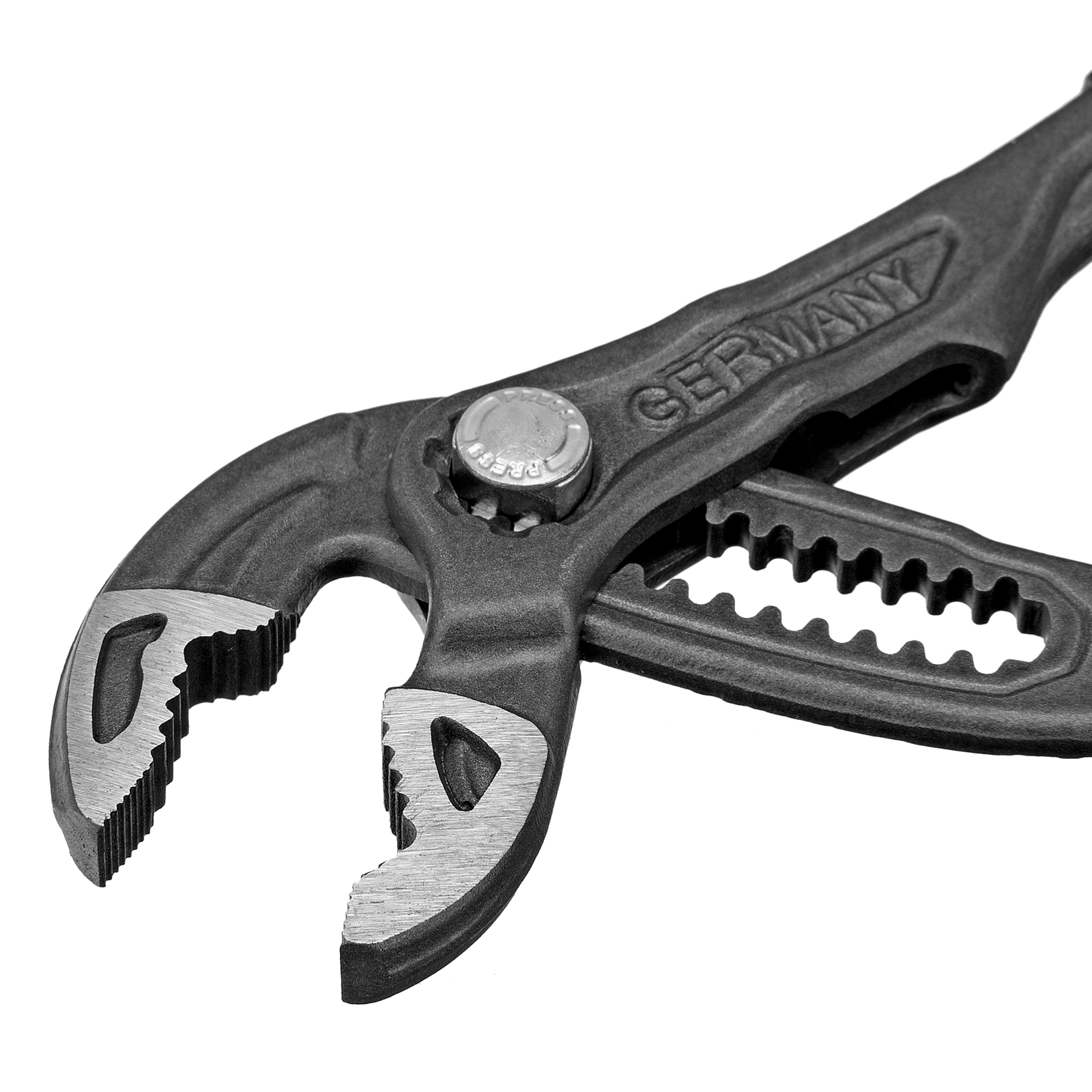- Удобная работа с деталями разного размера — кнопочный механизм позволяет быстро менять положение губок и фиксировать их в нужном положении.