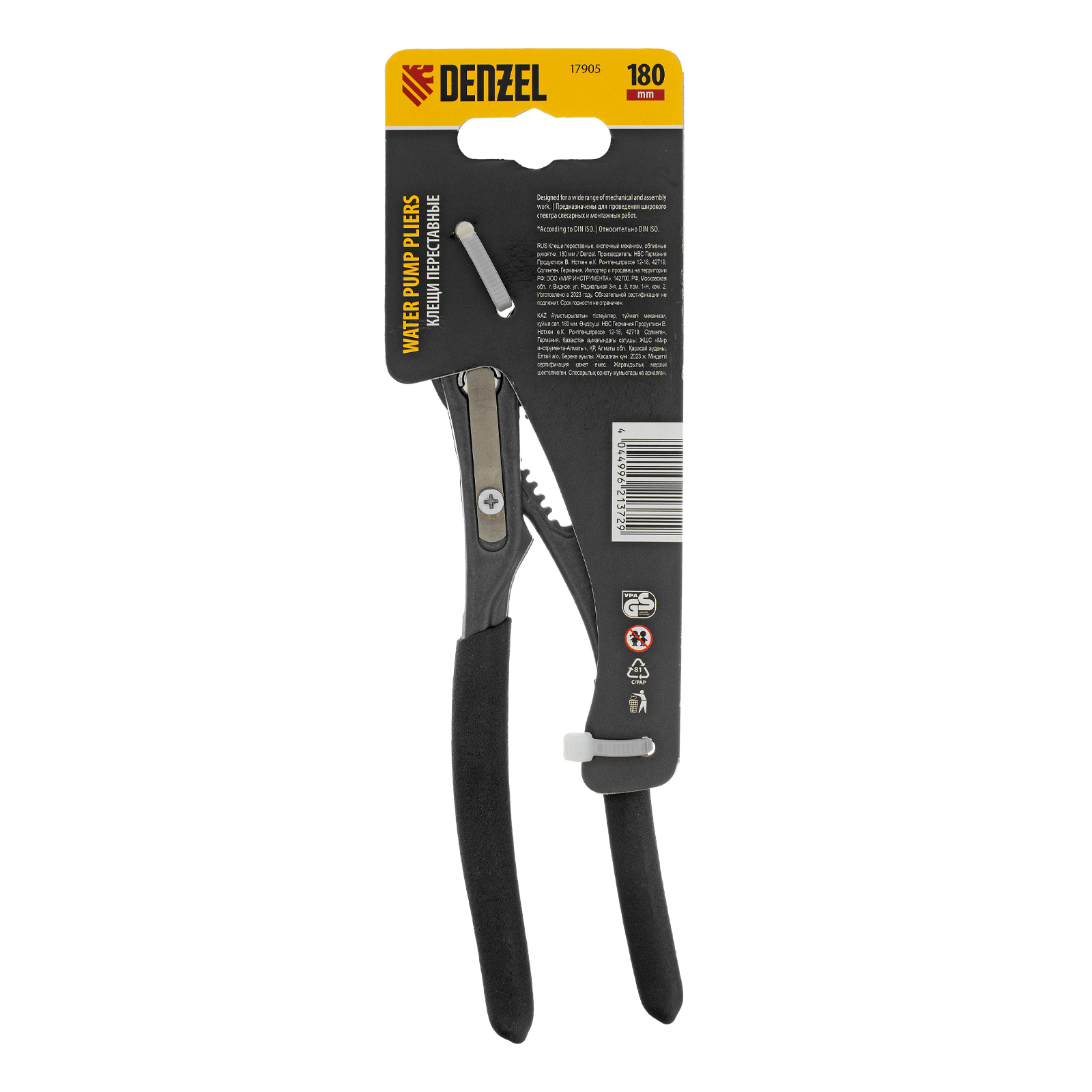 Переставные клещи Denzel 17905 длиной 180 мм, с обливными рукоятками и кнопочным механизмом, предназначены для фиксации и вращения деталей и заготовок различной формы. Подходят для захвата фитингов, труб, крепежных элементов. Инструмент удобен для работы в труднодоступных местах, используется при проведении ремонтных, монтажных, сантехнических работ.