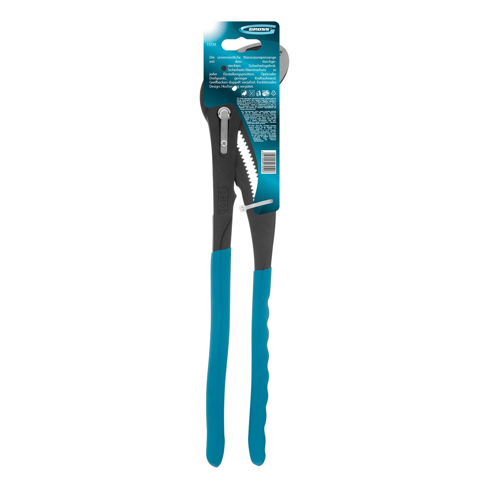 Переставные клещи Gross 15729 длиной 400 мм, с кнопочным механизмом и обливными рукоятками, — профессиональный инструмент для работ с сантехникой, фитингами, трубами и т.д. Рабочие губки с насечками обеспечивают надежный захват изделий диаметром до 95 мм. Клещи удобны для работы в труднодоступных местах.