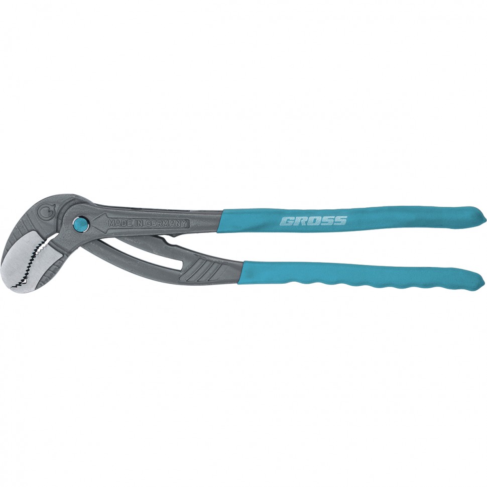 Трубные переставные клещи Gross S-Pipe 15720 длиной 400 мм, из хром-ванадия, с самозажимным механизмом и обливными рукоятками, — универсальный слесарно-монтажный инструмент. Зажимные губки раскрываются до 100 мм, что позволяет удерживать и вращать трубы и фитинги больших размеров. S-образный рабочий профиль обеспечивает возможность работы в труднодоступных местах.