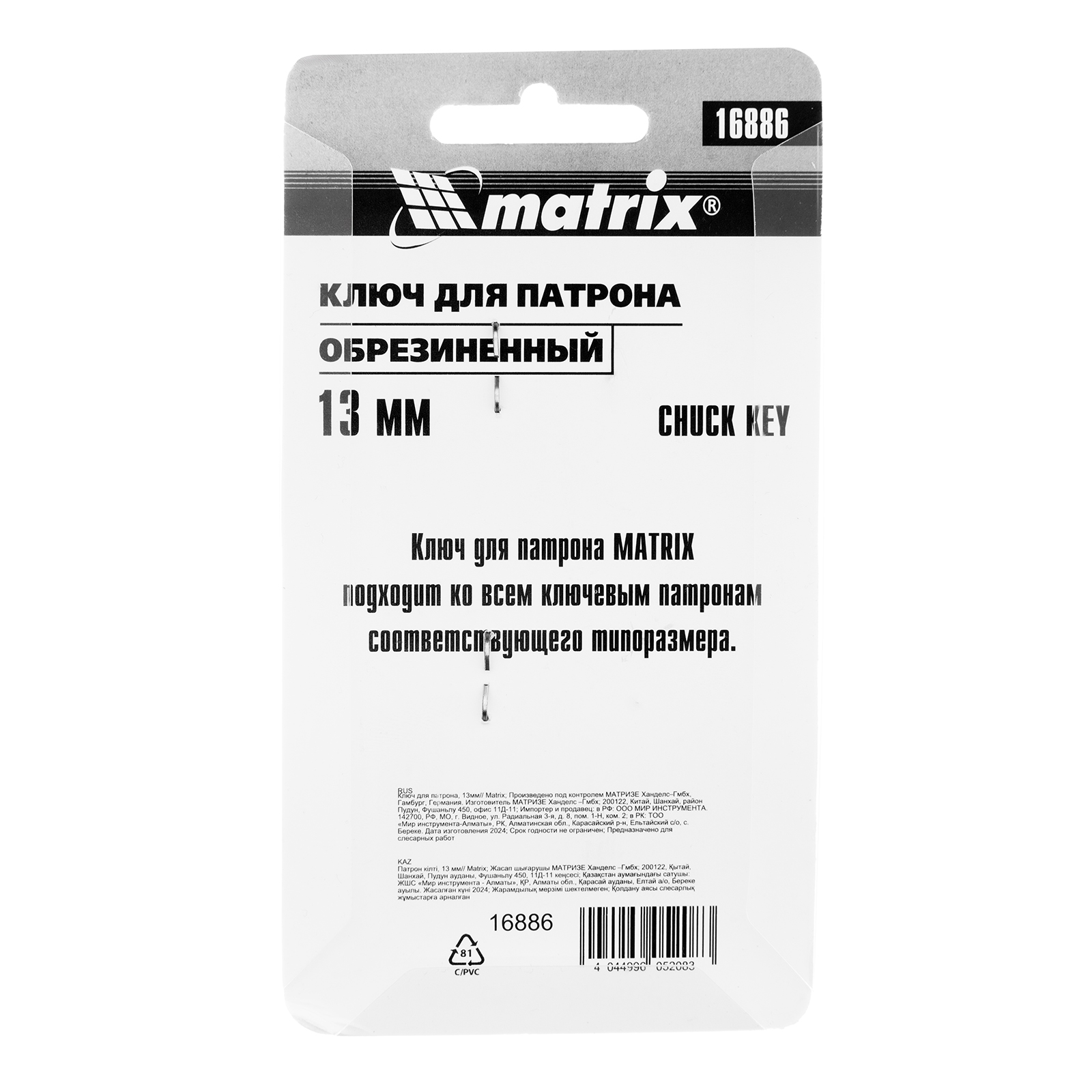 Ключ для патрона 13 мм Matrix 16886 обеспечивает надежную фиксацию оснастки в зажимном механизме сверлильного патрона. Пригодится как профессиональному строителю, так и домашнему мастеру.