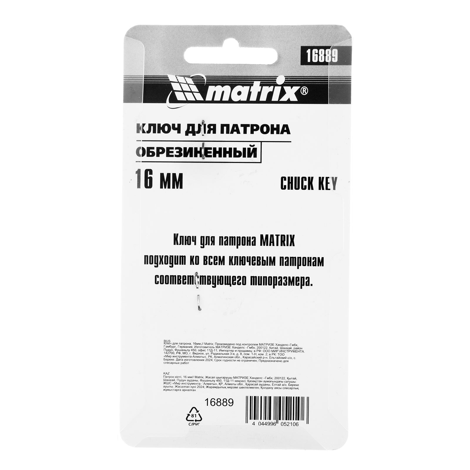 Ключ для патрона 16 мм Matrix 16889 обеспечивает надежную фиксацию оснастки в зажимном механизме сверлильного патрона. Пригодится как профессиональному строителю, так и домашнему мастеру.