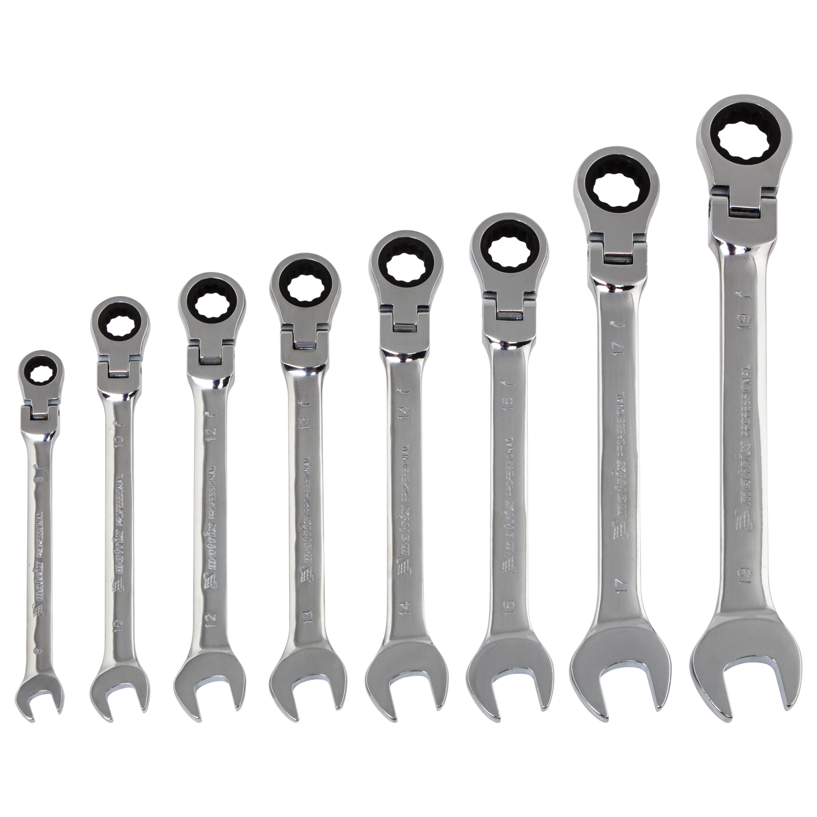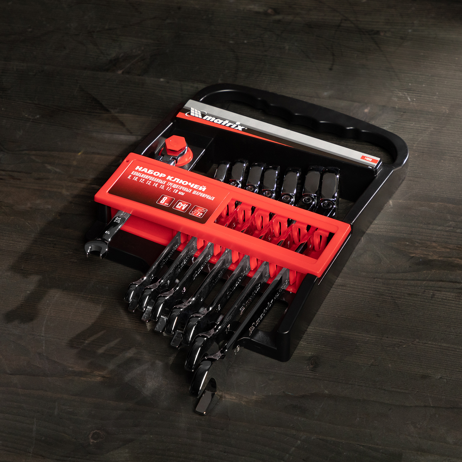 Набор из 8 комбинированных трещоточных шарнирных ключей Matrix 14898 пригодится мастерам и автолюбителям для фиксации и раскручивания крепежных элементов. Трещоточный механизм повышает скорость работы и легко справляется даже с закисшим крепежом.