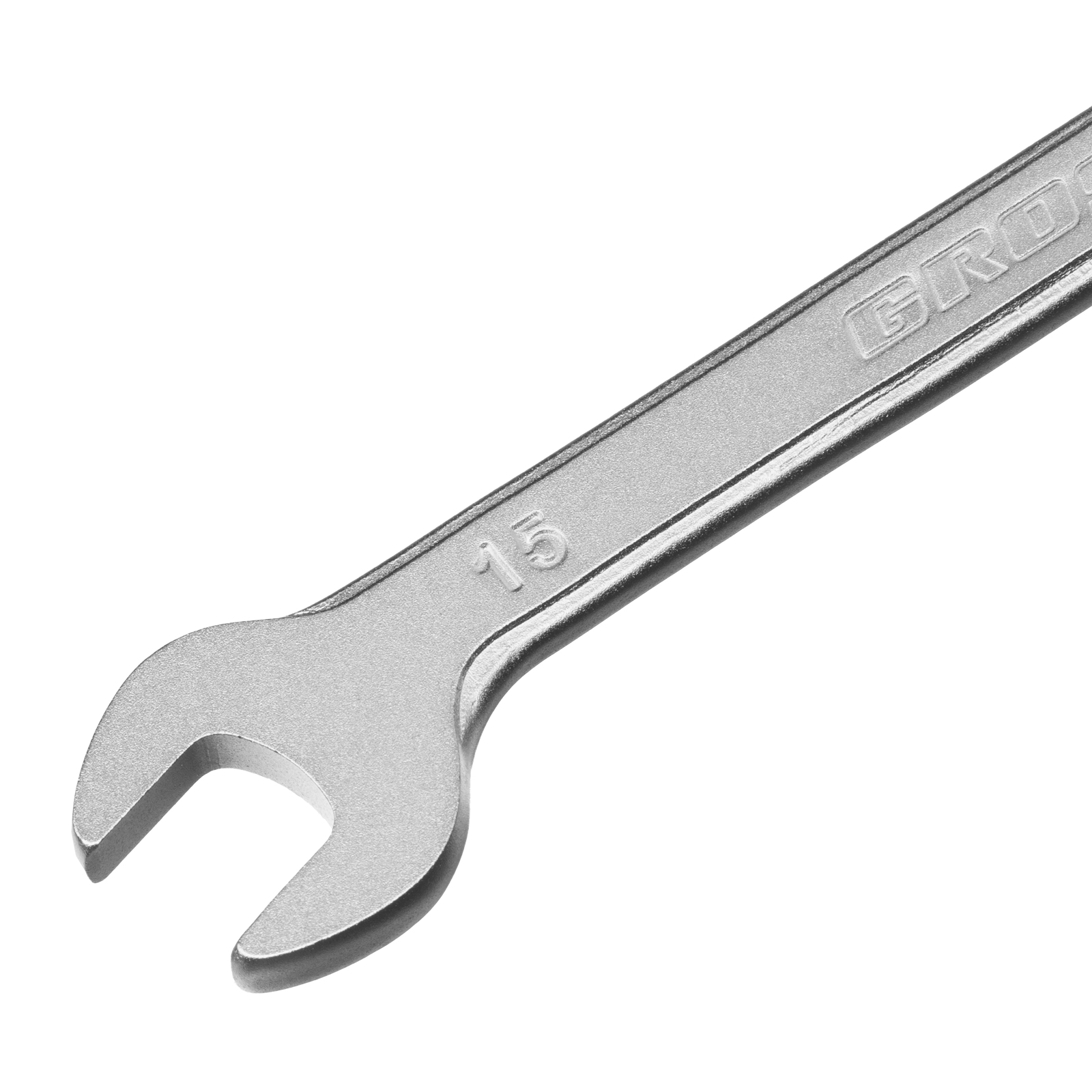 Комбинированный трещоточный ключ Gross 14853, 15 мм, используется при монтаже и демонтаже резьбовых соединений. Инструмент имеет как рожковую, так и накидную часть, что повышает его функциональность. У накидной части 12 внутренних граней, что увеличивает площадь соприкосновения с головкой крепежа и снижает риск ее деформации. Ключ применяется как в автосервисах, так и для самостоятельного ремонта автомобилей.
