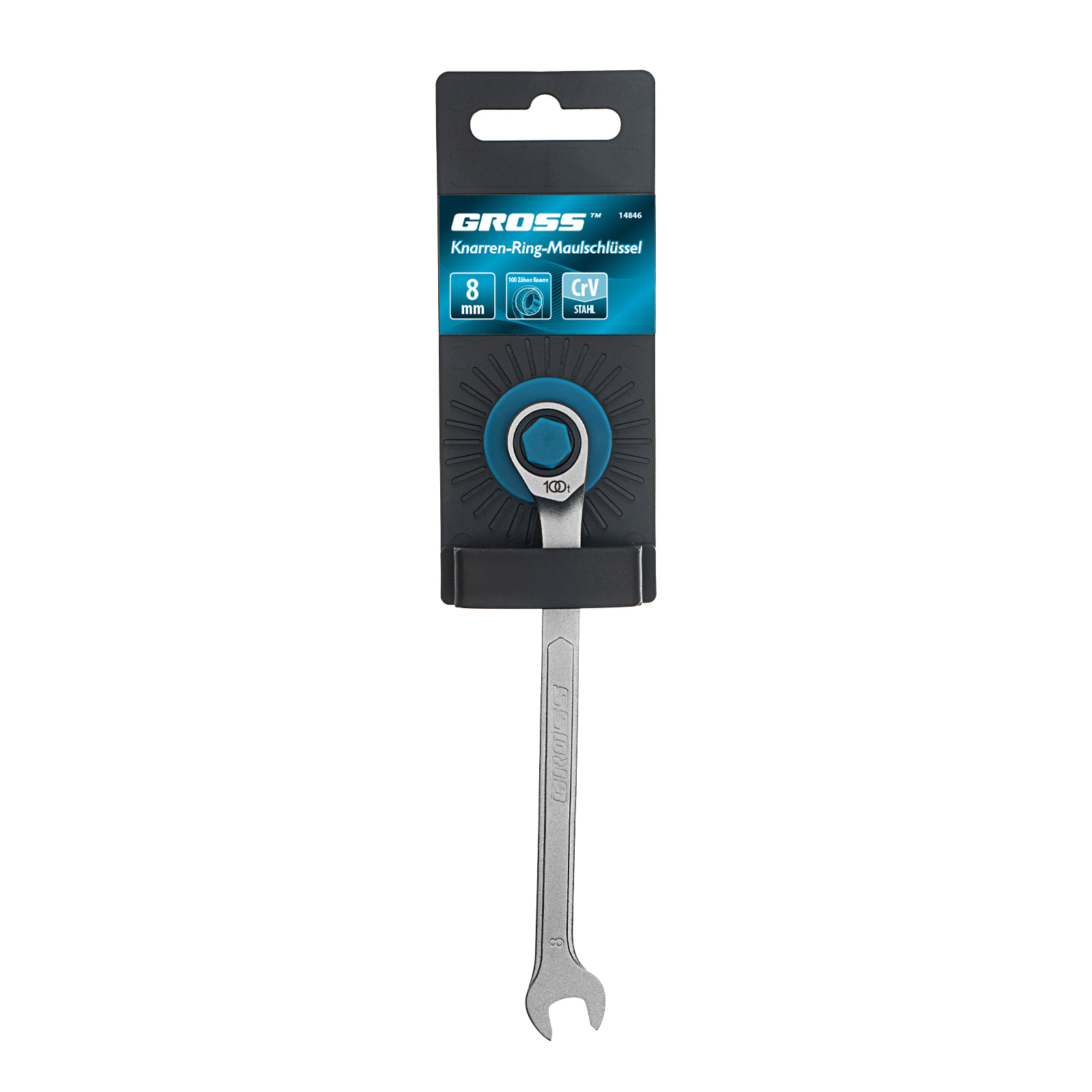 Комбинированный трещоточный ключ Gross 14846, 8 мм, используется при монтаже и демонтаже резьбовых соединений. Инструмент имеет как рожковую, так и накидную часть, что повышает его функциональность. У накидной части 12 внутренних граней, что увеличивает площадь соприкосновения с головкой крепежа и снижает риск ее деформации. Ключ применяется как в автосервисах, так и для самостоятельного ремонта автомобилей.