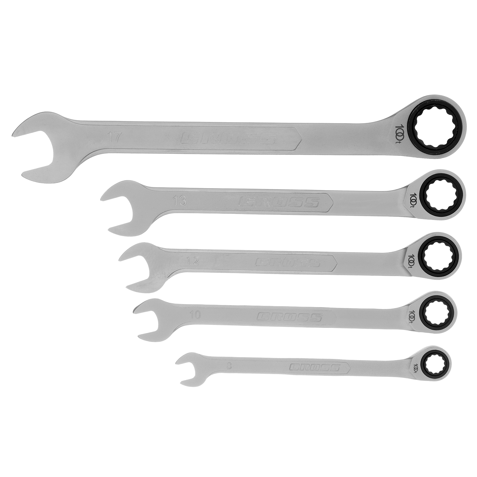 Набор комбинированных трещоточных ключей Gross 14858 включает 5 инструментов из стали CrV и используется при монтаже и демонтаже резьбовых соединений диаметром от 8 до 17 мм. Каждый ключ имеет как рожковую, так и накидную часть, что повышает его функциональность. У накидной части 12 внутренних граней, что увеличивает площадь соприкосновения с головкой крепежа и снижает риск ее деформации. Усиленная рожковая часть каждого ключа позволяет справляться с заржавевшим и крепко затянутым крепежом. Ключи применяются как в автосервисах, так и для самостоятельного ремонта автомобилей.