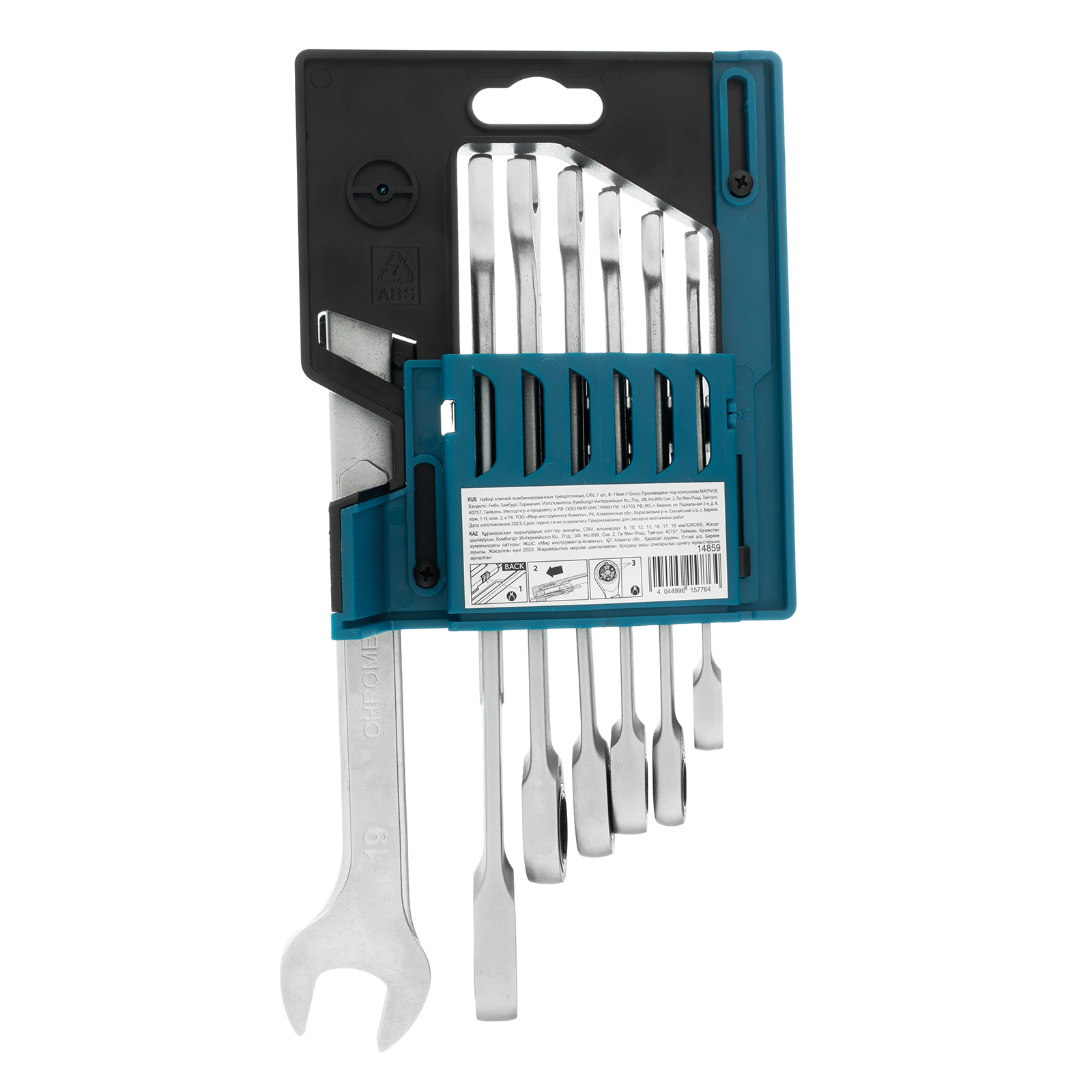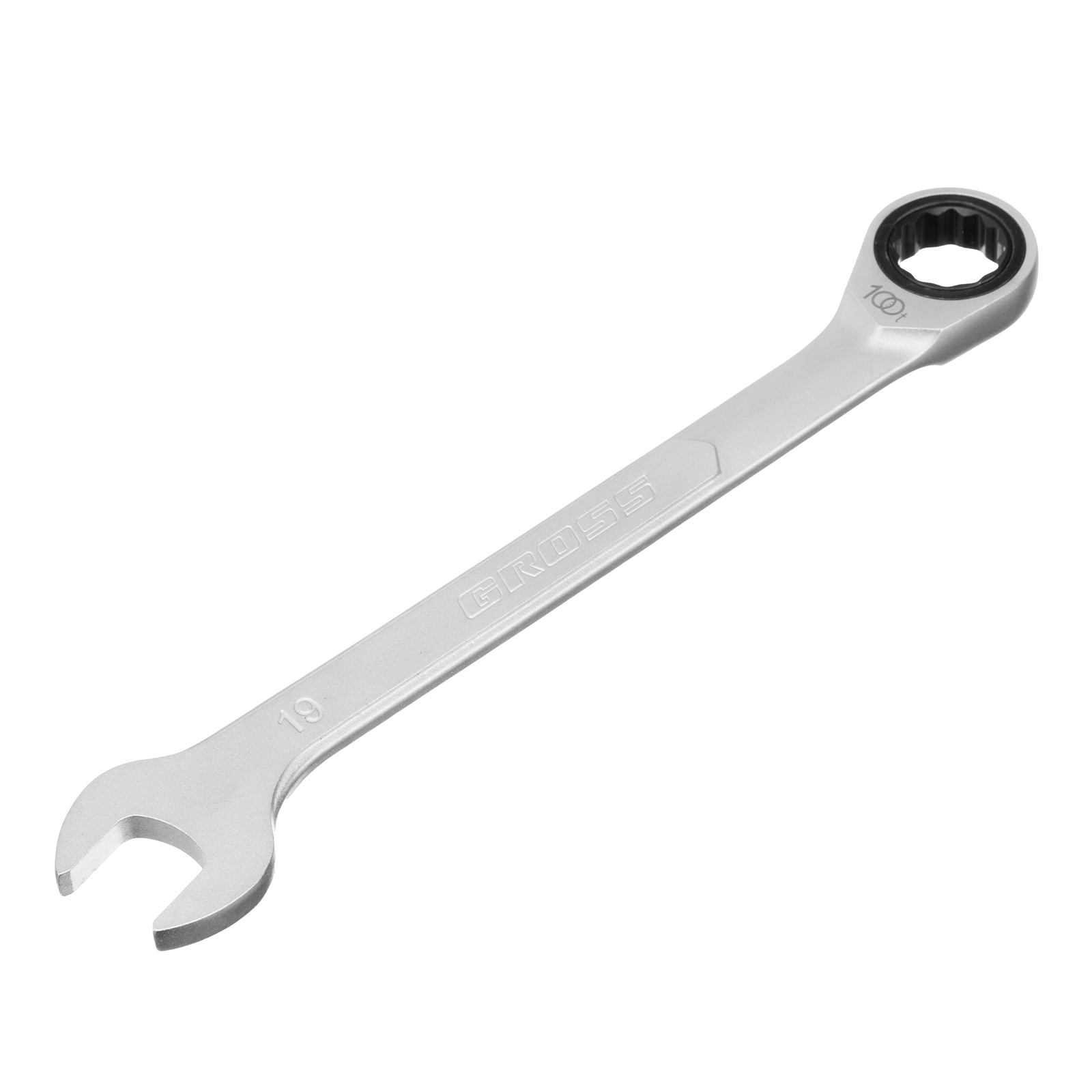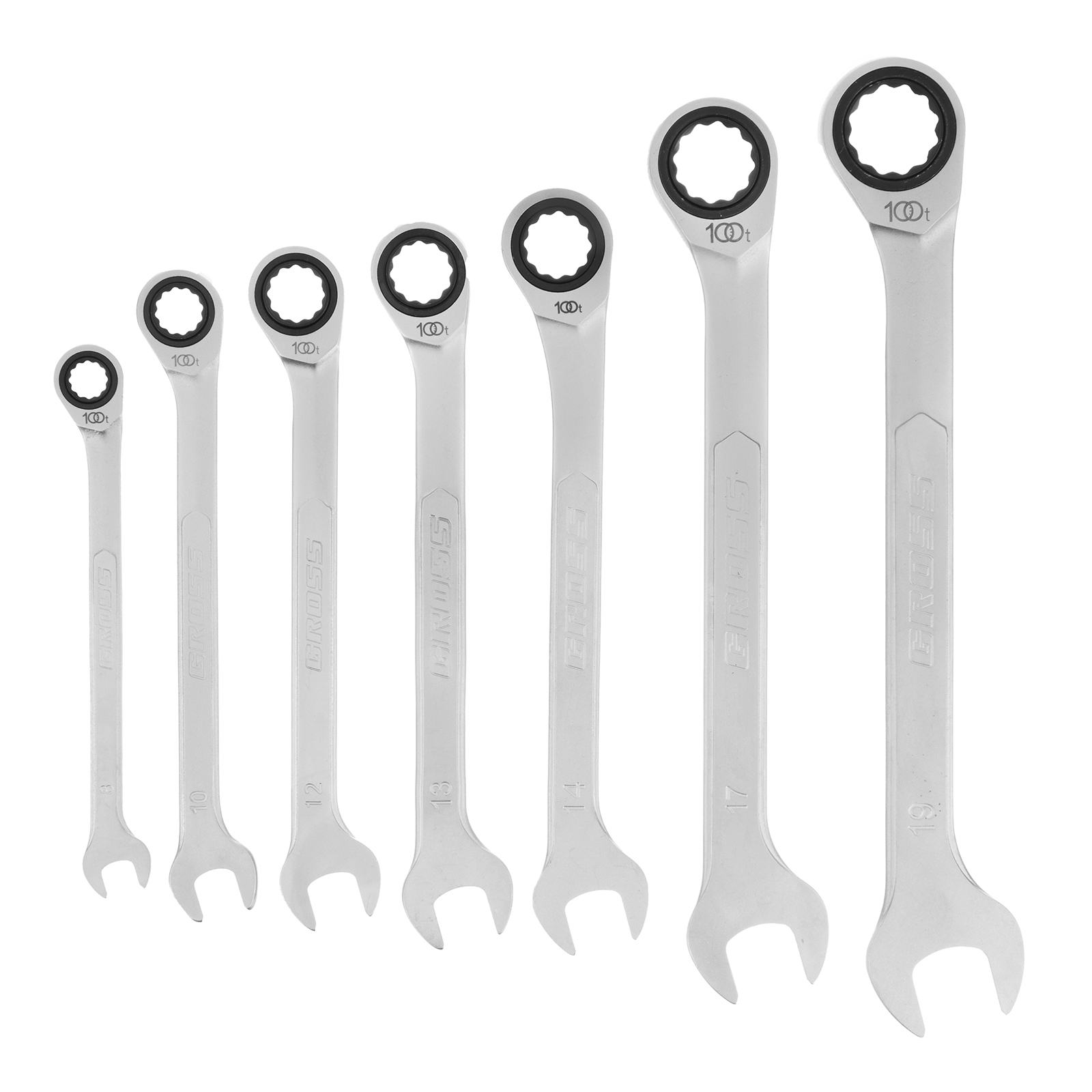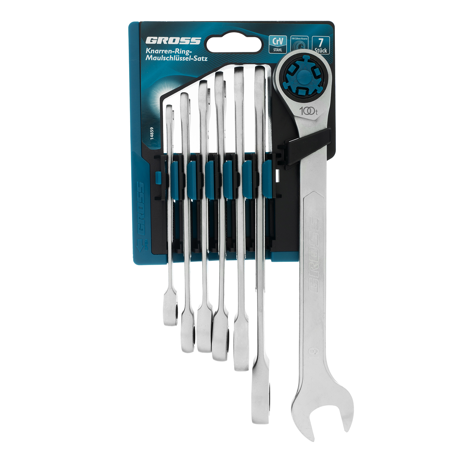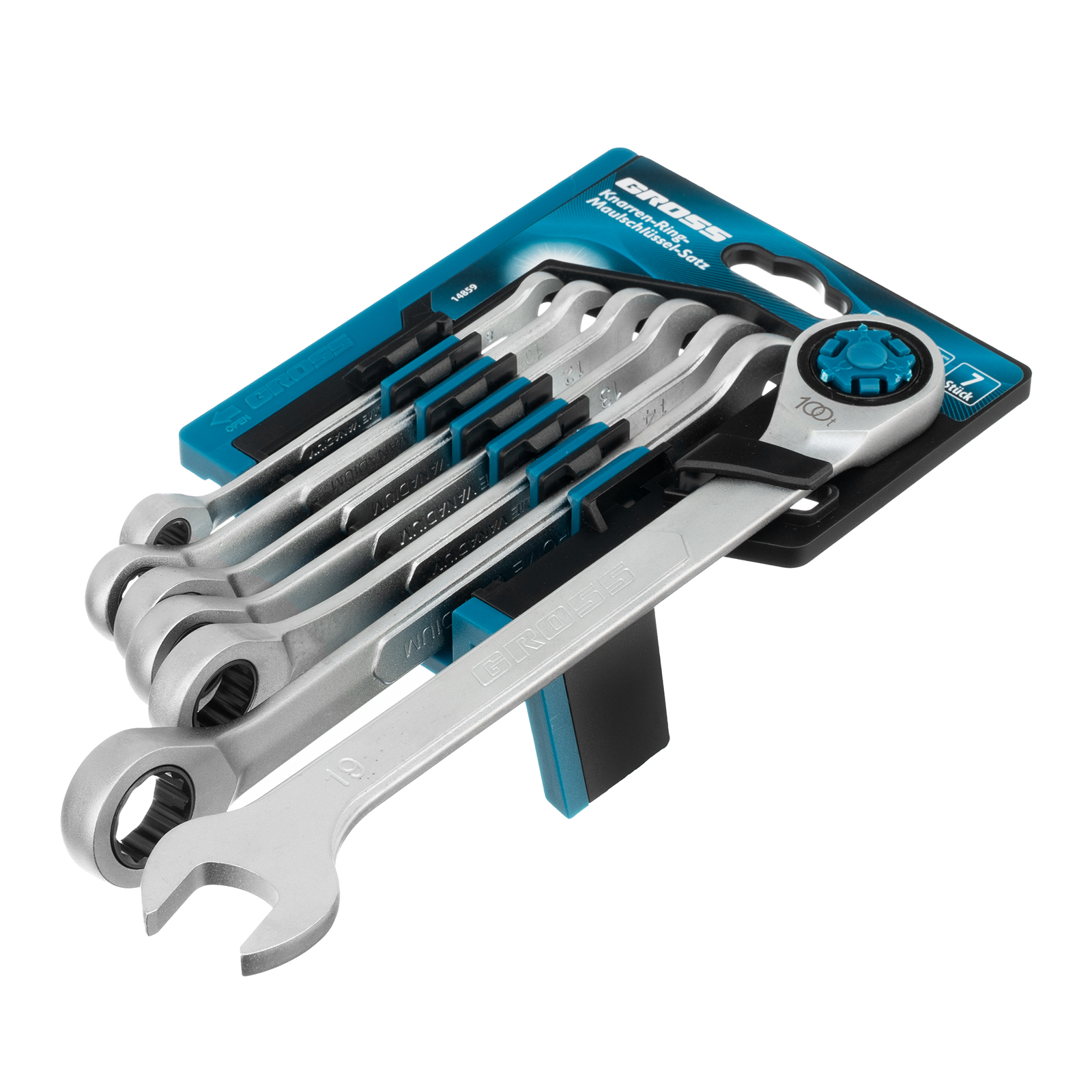 Набор комбинированных трещоточных ключей Gross 14859 включает в себя 7 инструментов из стали CrV и используется для монтажа и демонтажа резьбовых соединений диаметром от 8 до 19 мм. Ключи имеют как рожковую, так и накидную часть, что повышает их функциональность. У накидной части 12 внутренних граней, что увеличивает площадь соприкосновения с головкой крепежа и снижает риск ее деформации. Ключи применяются как в автосервисах, так и для самостоятельного ремонта автомобилей.