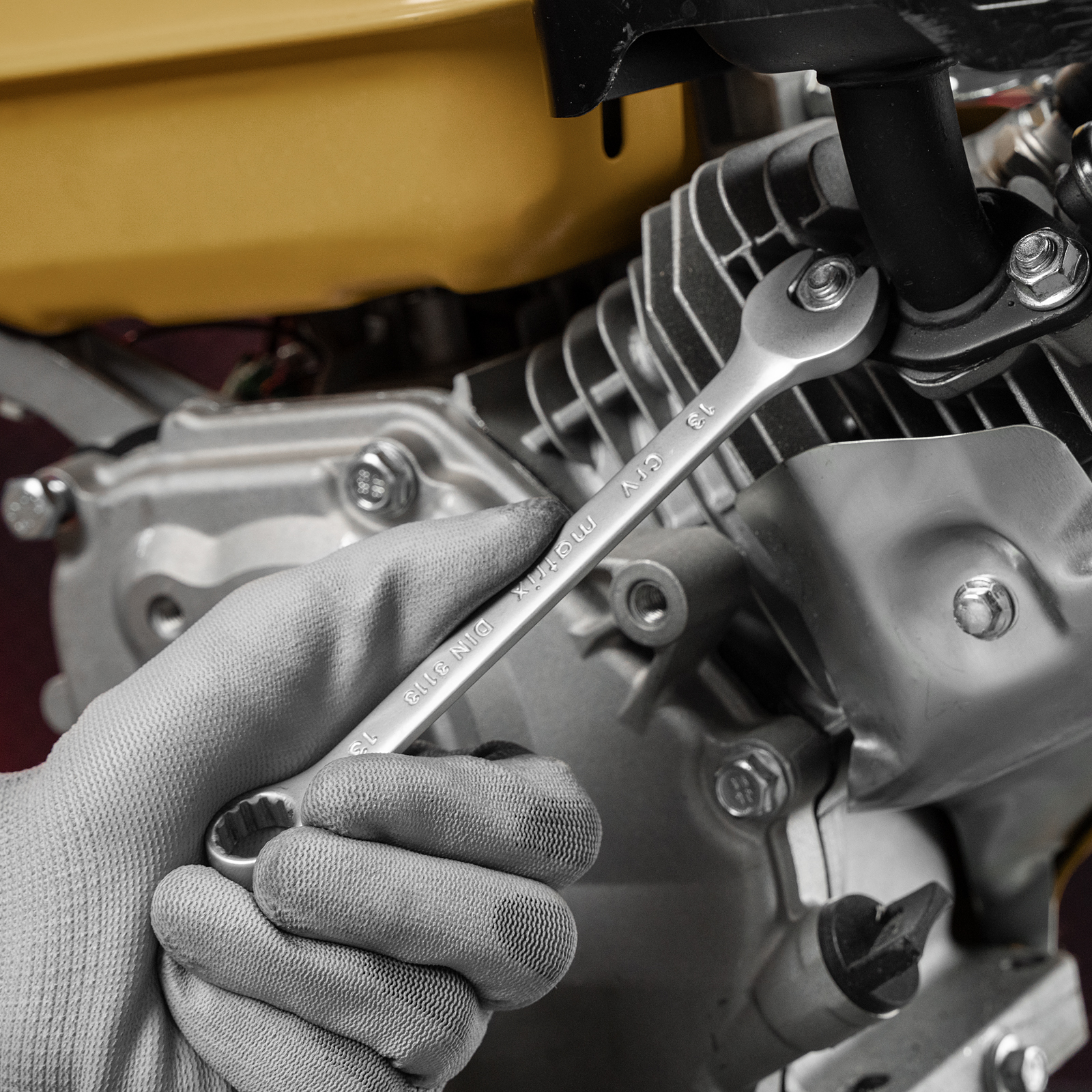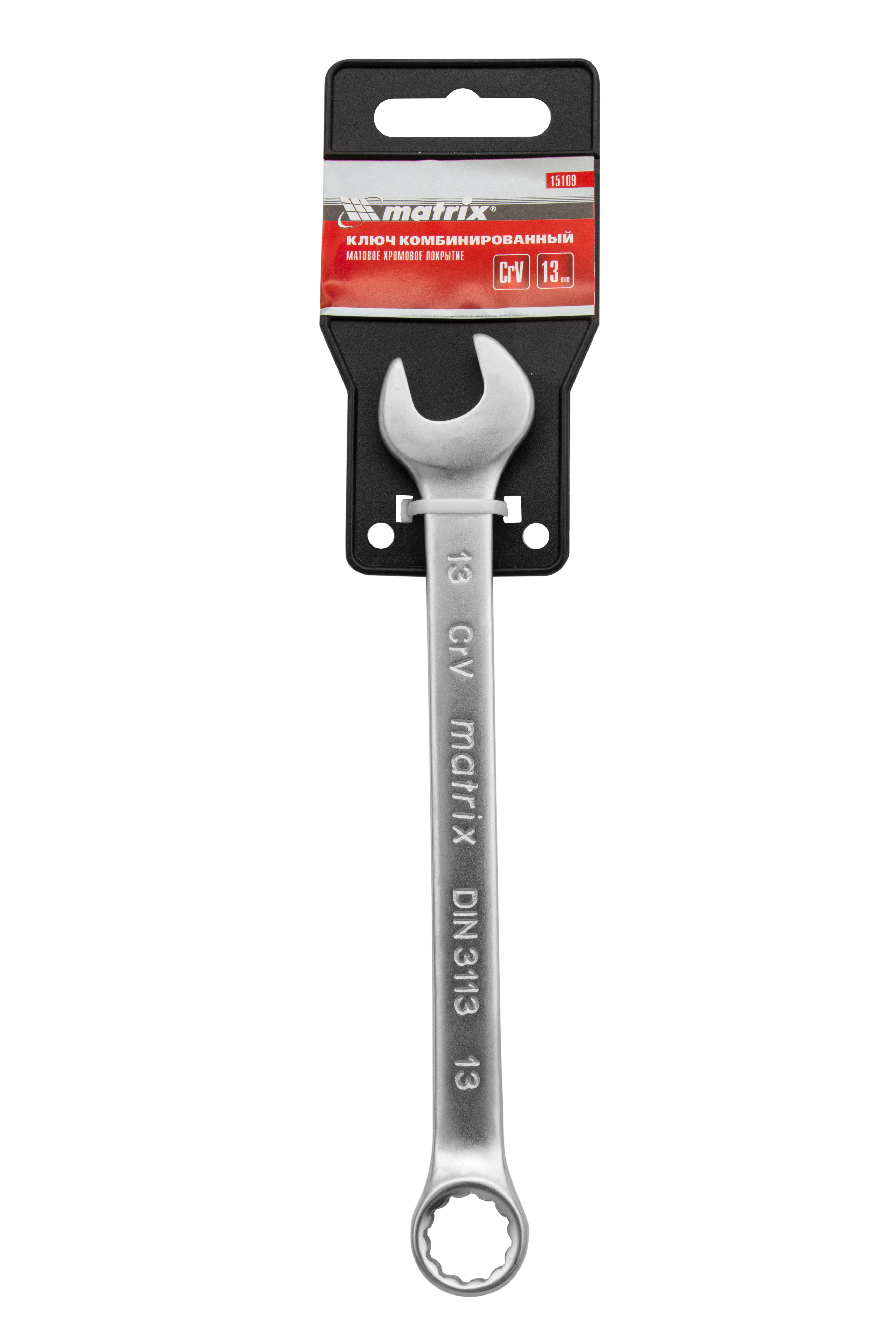 Комбинированный ключ Matrix 15109 размером 13 мм, из стали CrV, с покрытием «матовый хром», пригодится во время ремонтных работ дома или в гараже. С его помощью можно быстро монтировать и демонтировать крепежные элементы. Угол наклона кольцевого зева относительно плоскости инструмента составляет 15°, поэтому ключом удобно работать в труднодоступных местах.