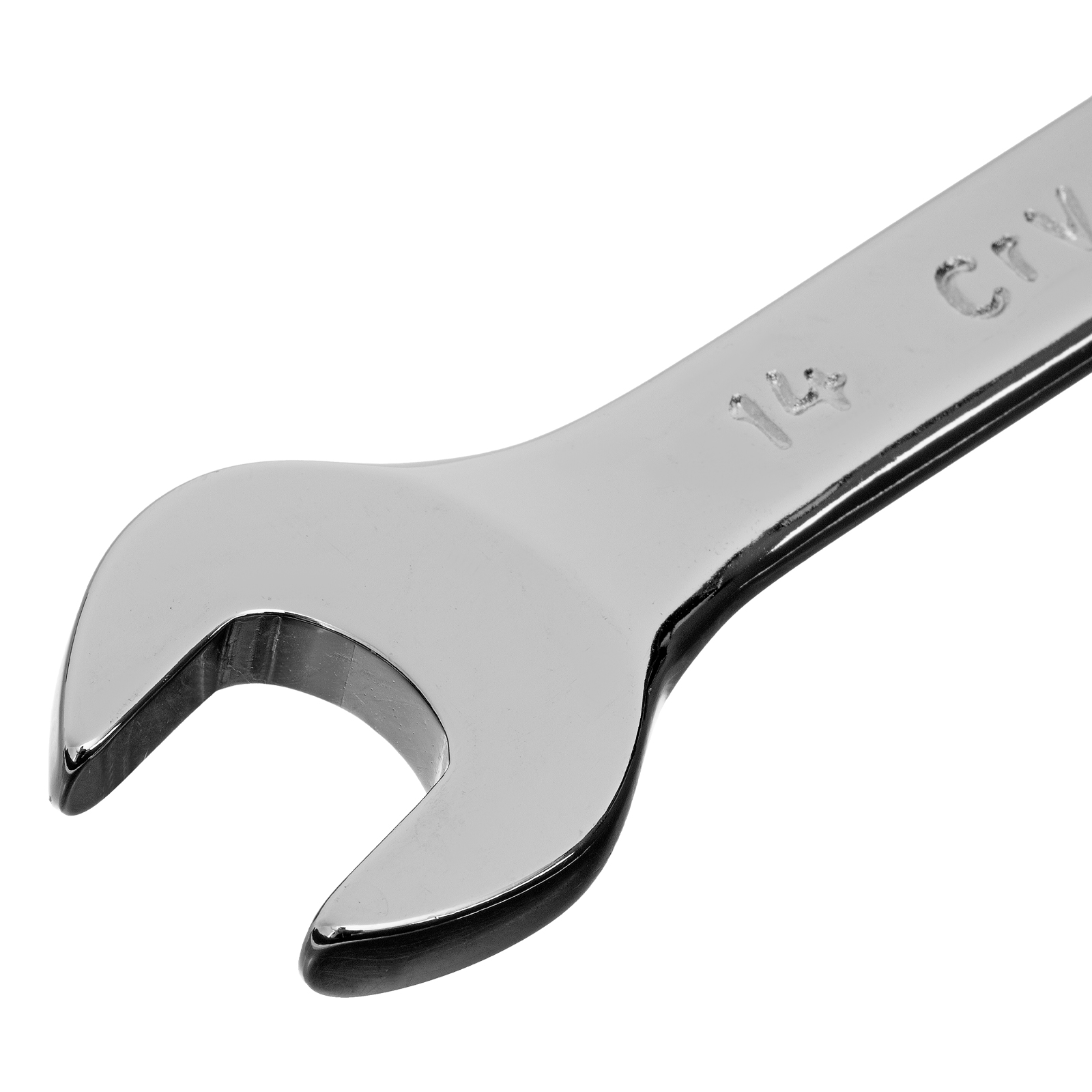 Комбинированный ключ Matrix 15158 размером 14 мм, из стали CrV, с покрытием «полированный хром», пригодится во время ремонтных работ дома или в гараже. С его помощью можно быстро монтировать и демонтировать крепежные элементы. Угол наклона кольцевого зева относительно плоскости инструмента составляет 15°, поэтому ключом удобно работать в труднодоступных местах.