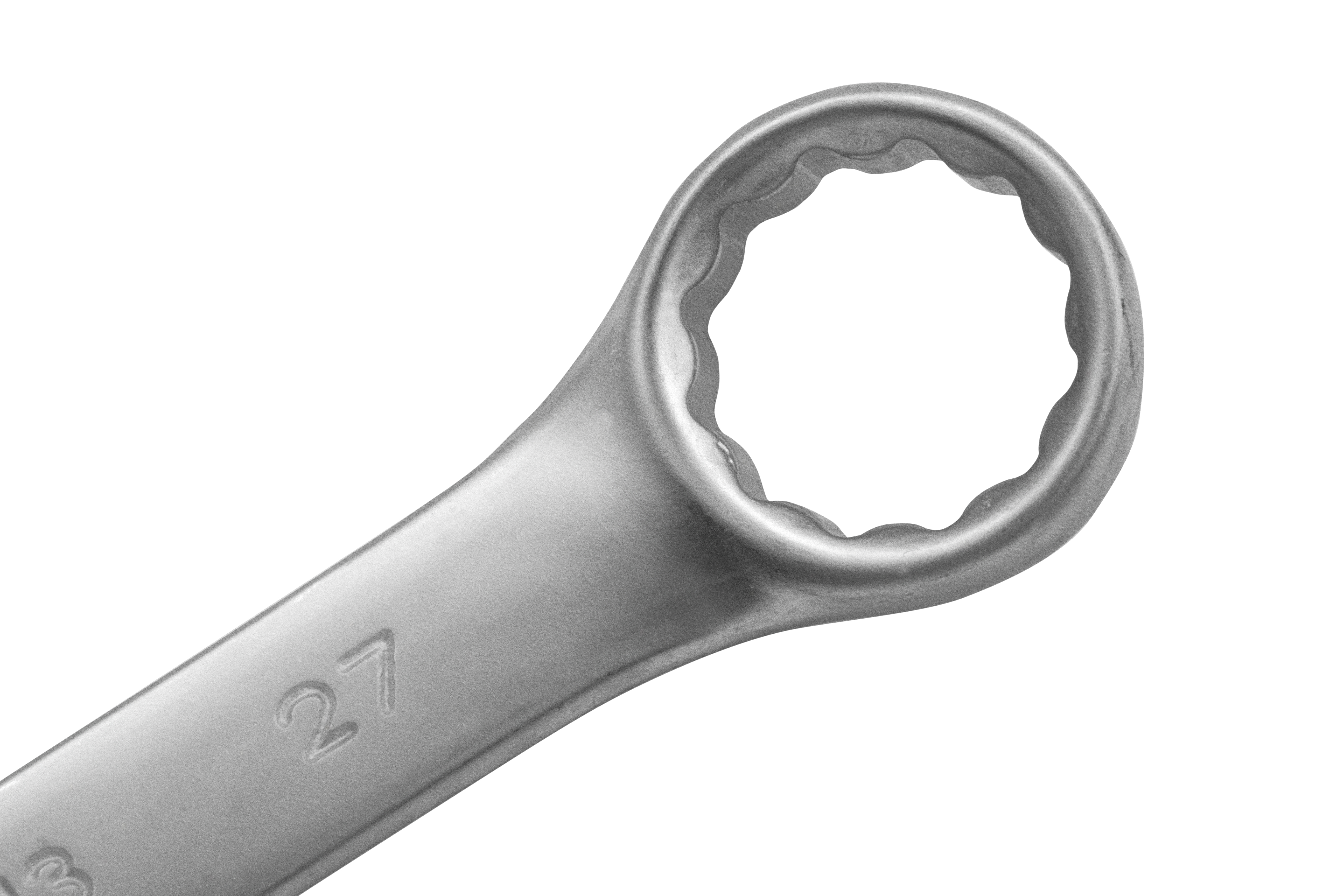 Комбинированный ключ Matrix 15120 размером 27 мм, из стали CrV, с покрытием «матовый хром», пригодится во время ремонтных работ дома или в гараже. С его помощью можно быстро монтировать и демонтировать крепежные элементы. Угол наклона кольцевого зева относительно плоскости инструмента составляет 15°, поэтому ключом удобно работать в труднодоступных местах.