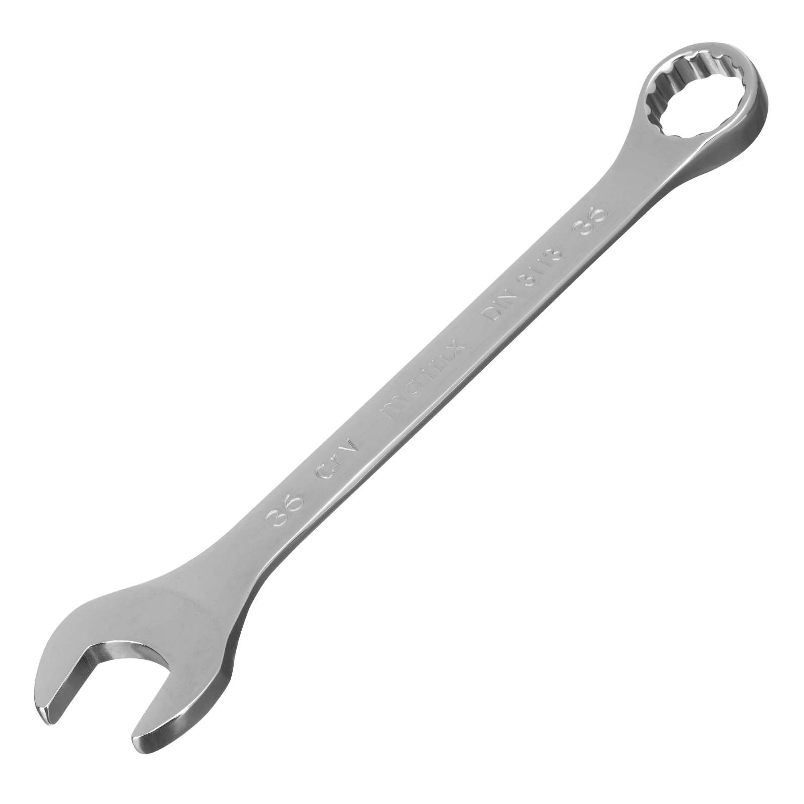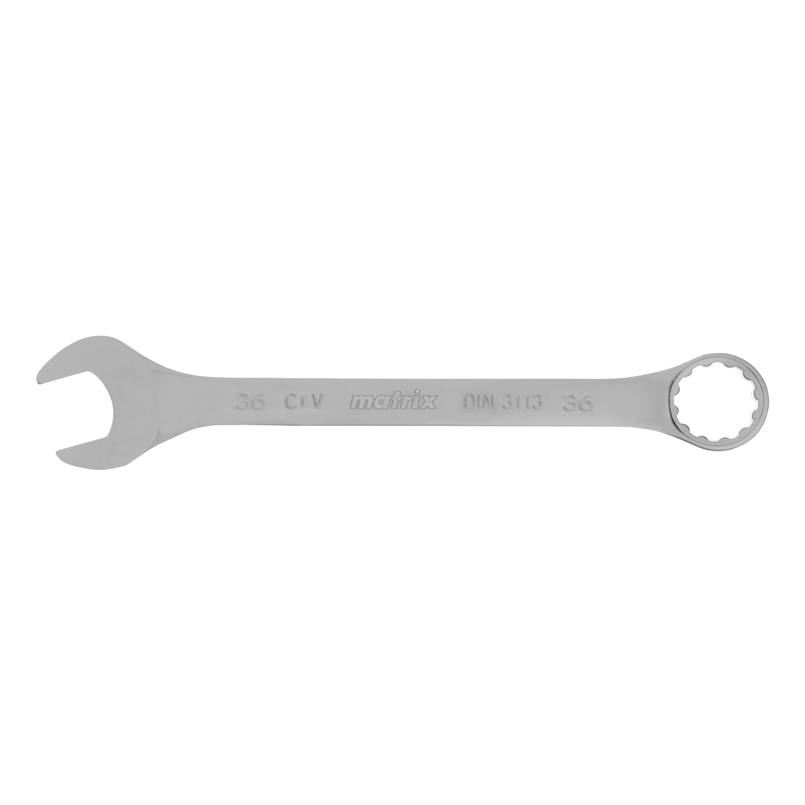 Комбинированный ключ Matrix 15175 размером 36 мм, из стали CrV, с покрытием «полированный хром», пригодится во время ремонтных работ дома или в гараже. С его помощью можно быстро монтировать и демонтировать крепежные элементы. Угол наклона кольцевого зева относительно плоскости инструмента составляет 15°, поэтому ключом удобно работать в труднодоступных местах.