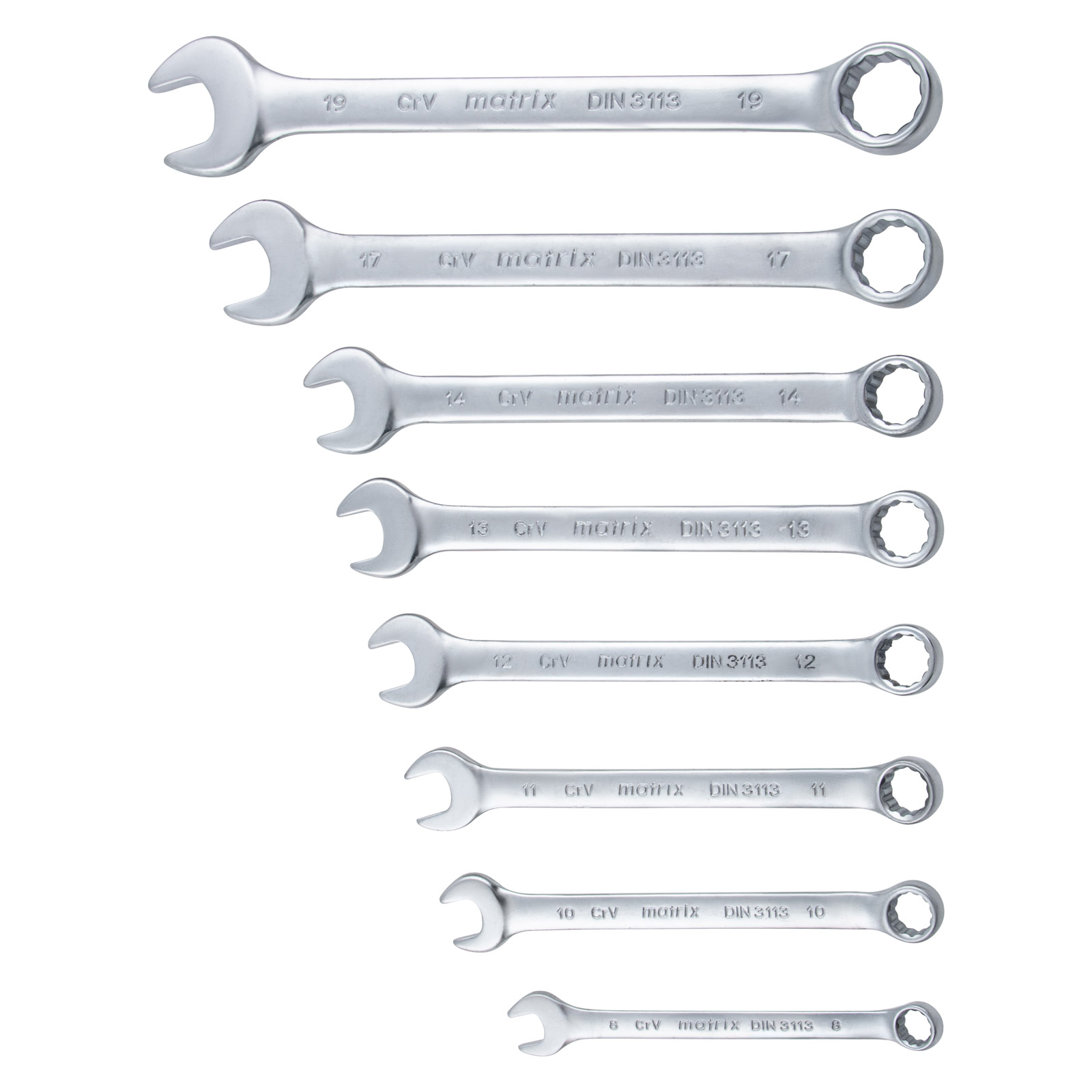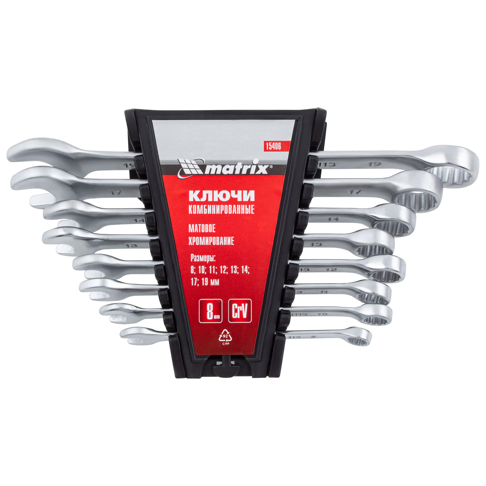 Набор Matrix 15406 включает 8 комбинированных ключей из стали CrV, размером 8-19 мм, с покрытием «матовый хром», которые пригодятся во время ремонтных работ дома или в гараже. С их помощью можно быстро монтировать и демонтировать крепежные элементы. В набор входят инструменты основных типоразмеров, позволяющие эффективно решать поставленные задачи.