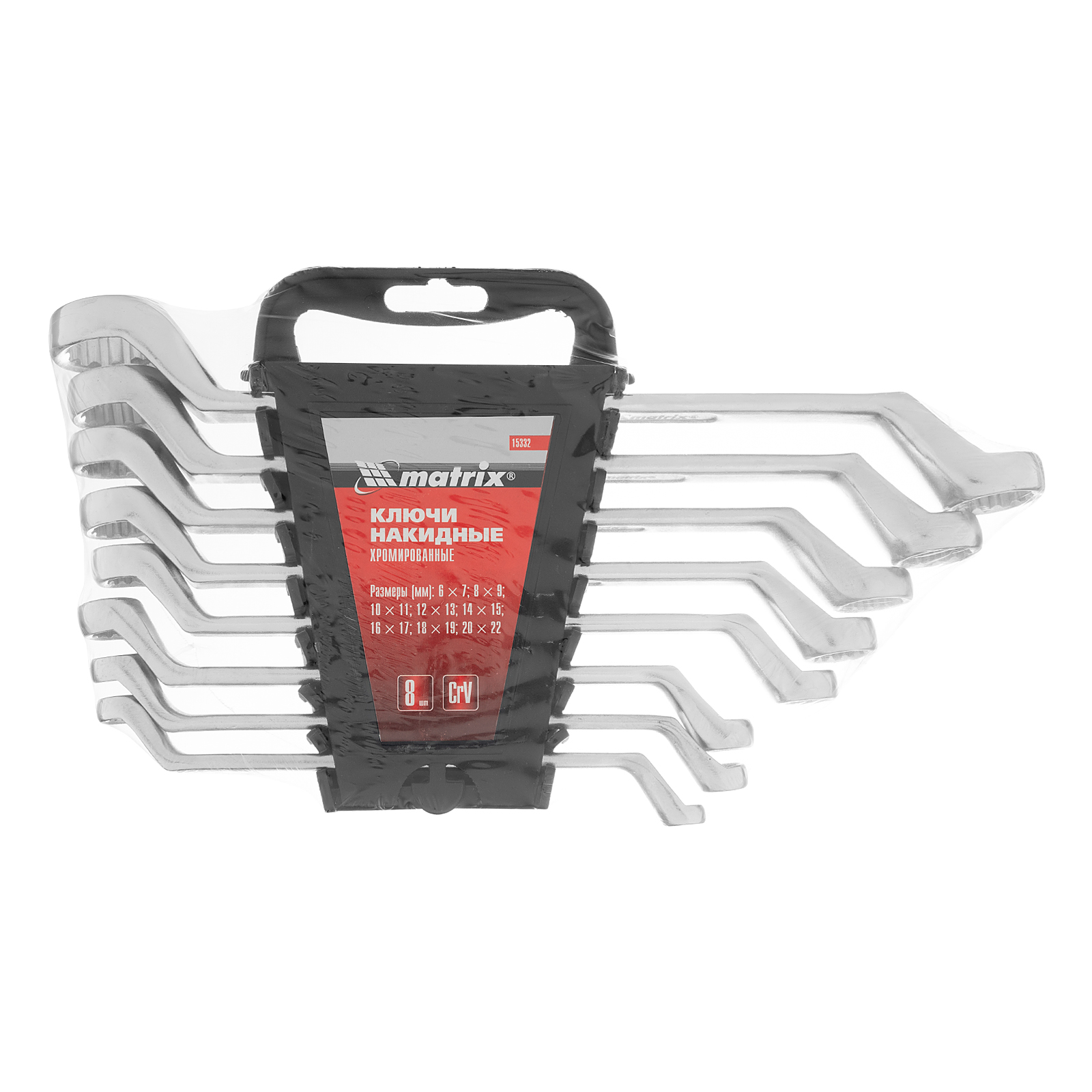 Набор из 8 накидных ключей Matrix 15332 из стали CR-V, с покрытием из полированного хрома, предназначен для монтажа и демонтажа крепежных элементов размером 6-22 мм. Накидные рабочие части с круглым профилем полностью охватывают головку крепежа и легко справляются даже с закисшими болтами и гайками. Благодаря изогнутой форме ключи удобны для работы в труднодоступных местах. Инструменты подходят для эксплуатации в бытовых условиях, автосервисе и частной мастерской.