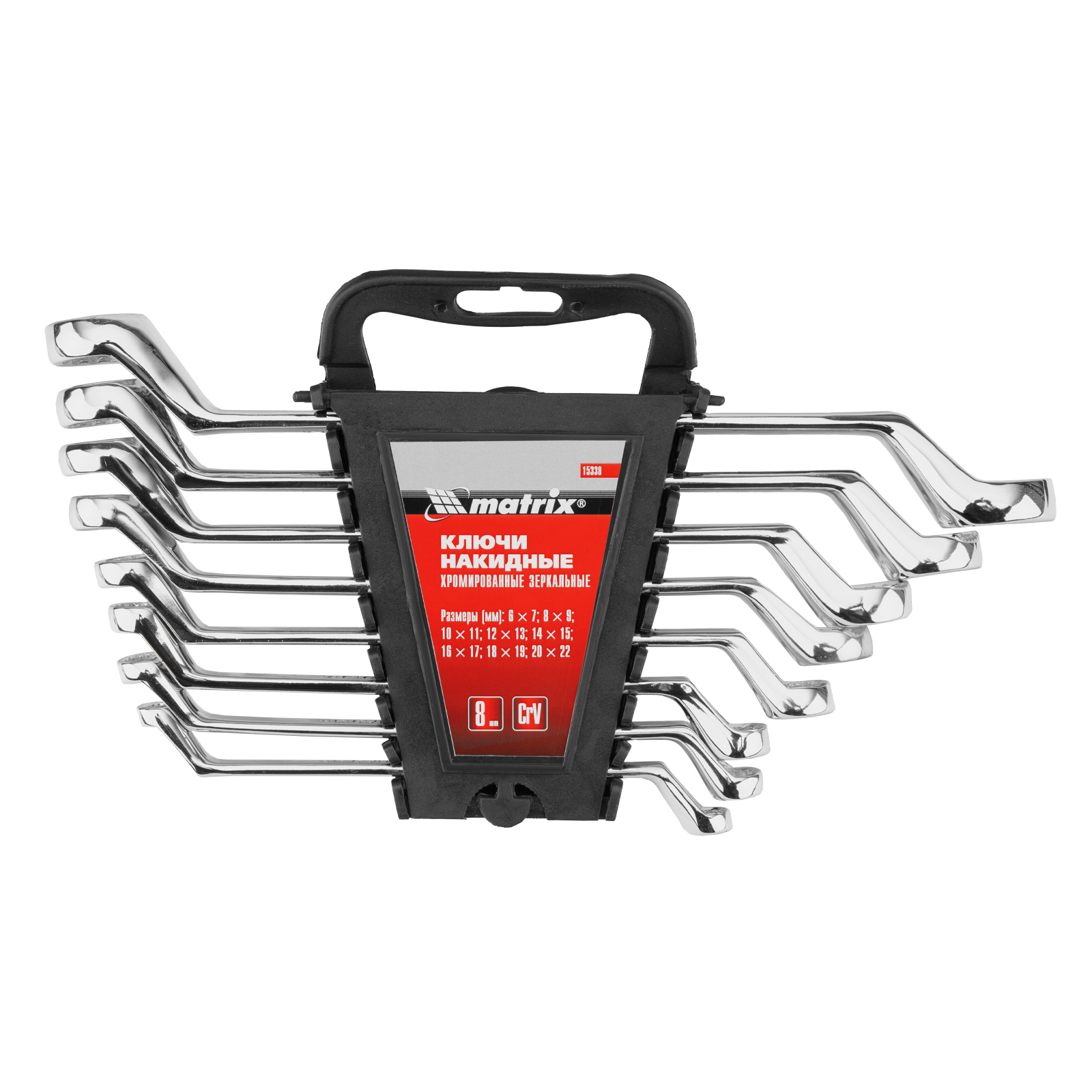 Набор из 8 накидных ключей Matrix Elliptical 15338 с зеркальным хромированием, из стали CrV, предназначен для откручивания и закручивания болтовых соединений диаметром 6-22 мм. Будет полезен слесарям, строителям, автомеханикам и другим мастерам для проведения ремонтных работ.