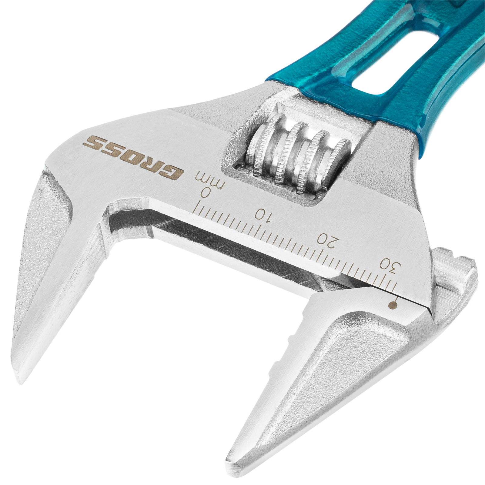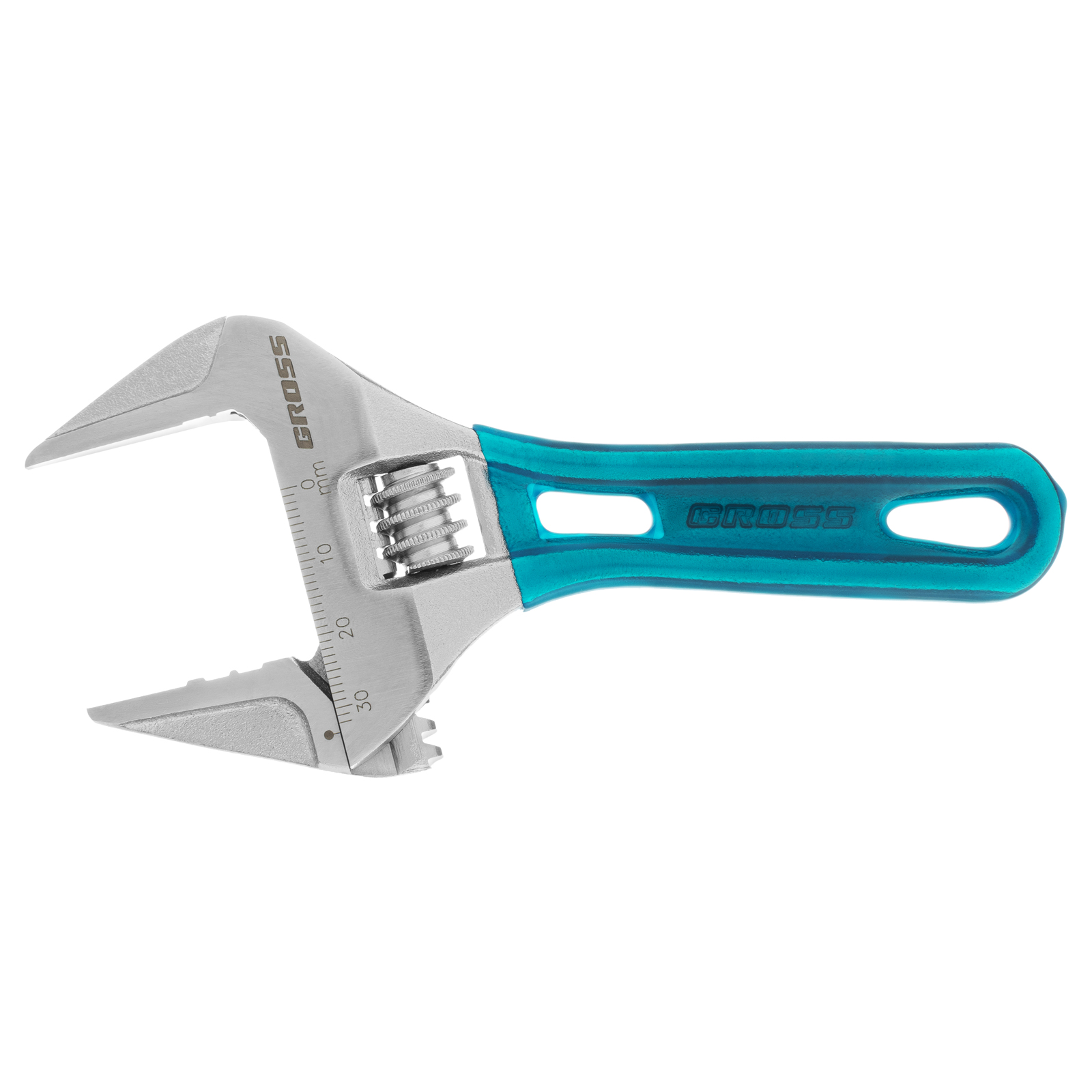 Разводной ключ Gross 15565 длиной 140 мм, из стали CrV, с укороченной ручкой и диапазоном раскрытия зева до 32 мм, подходит для работы как с мелкими, так и с крупными крепежными элементами. Губки раскрываются на 50% больше, чем у стандартных ключей. Ребристая рабочая поверхность губок обеспечивает надежный захват деталей и повышает точность работы.