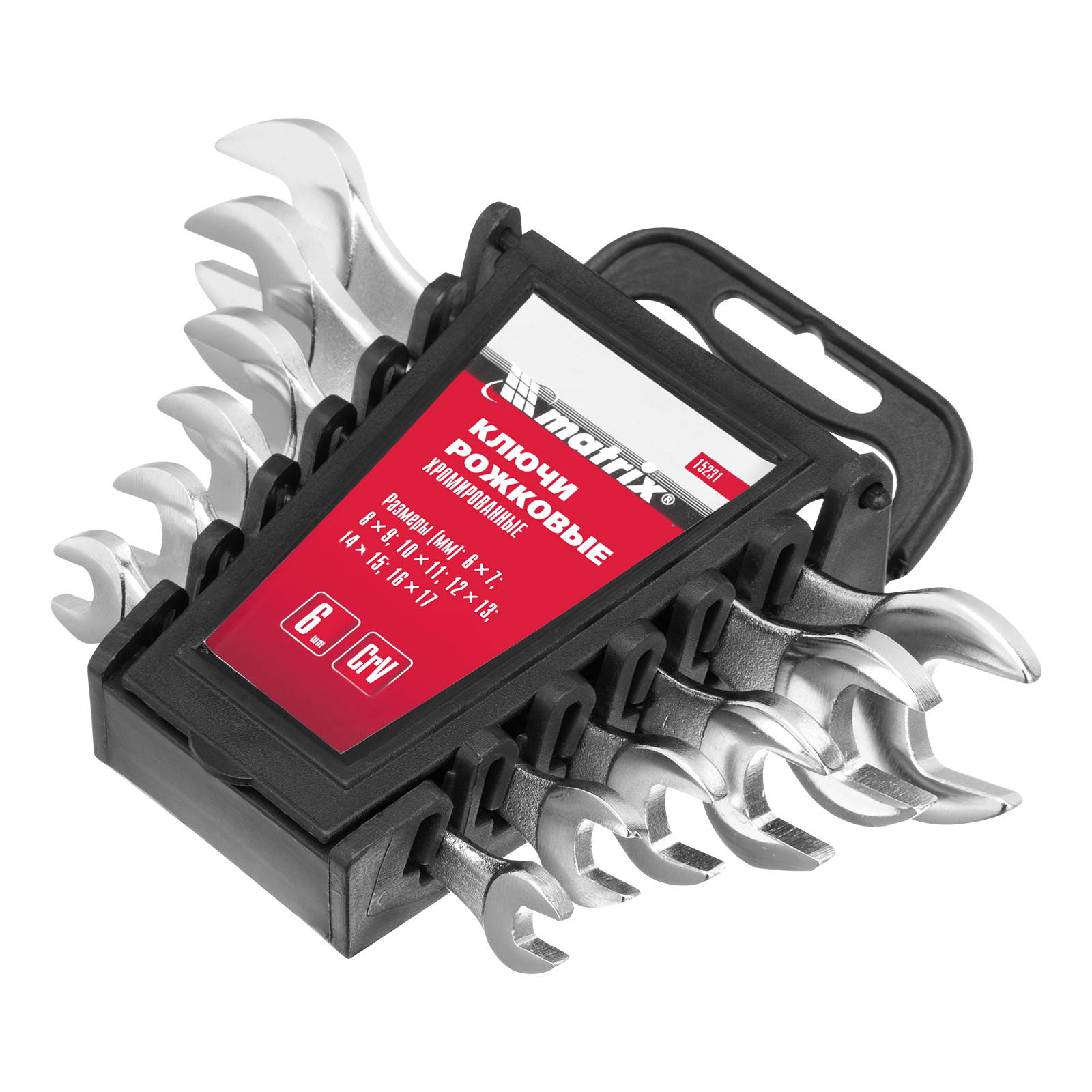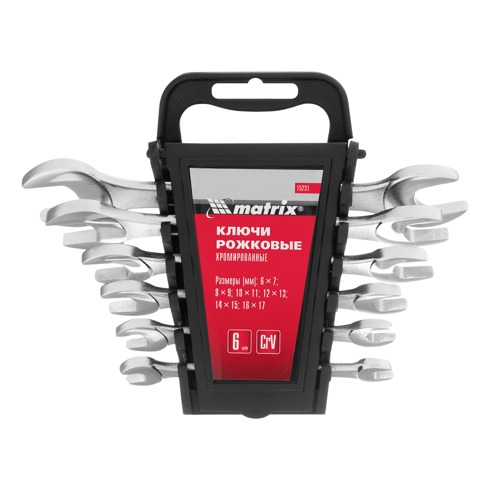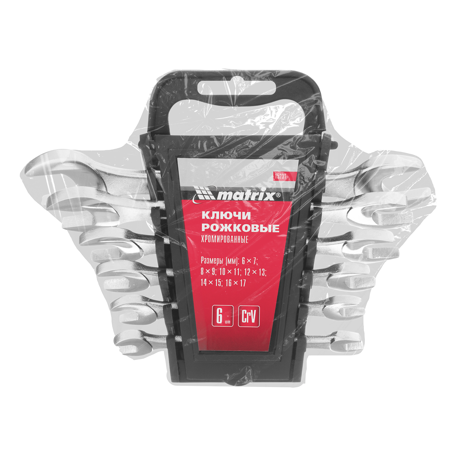 Набор ключей рожковых хромированных Matrix 15231 состоит из 6 инструментов с величиной зева от 6 до 17 мм, выполненных из стали CrV. Используется для монтажа и демонтажа гаечных, болтовых и других резьбовых соединений с шестигранным профилем. Ключи удобны для работы в ограниченном пространстве благодаря небольшому наклону губок относительно рукоятки. Набор пригодится в слесарной или авторемонтной мастерской, сервисном центре, а также дома, в гараже или на даче.