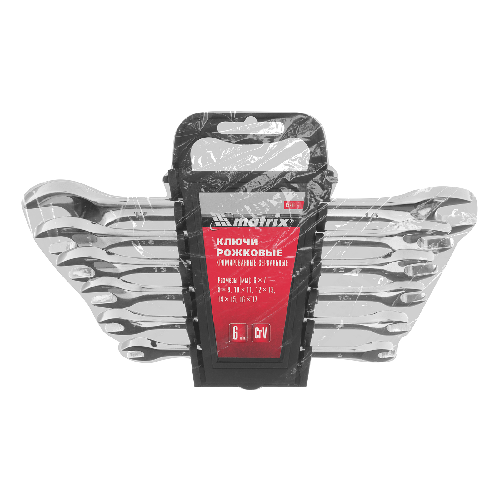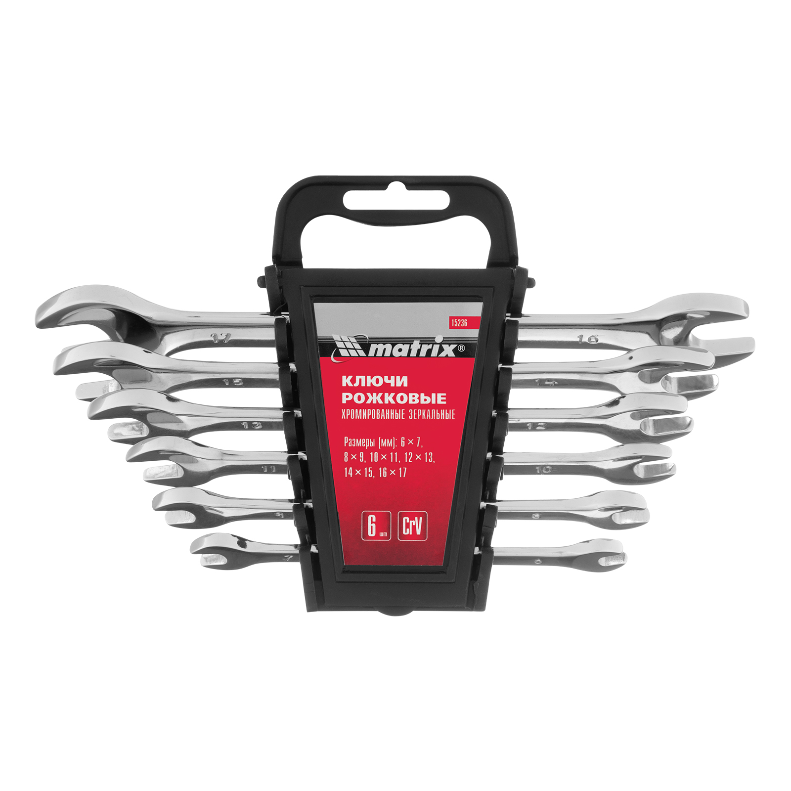 Набор Matrix Elliptical 15236 включает в себя 6 рожковых ключей из стали CrV с зеркальным хромированием и предназначен для закручивания и откручивания резьбовых соединений с шестигранным профилем и размером головки от 6 до 17 мм. Ключи удобны для манипуляций в ограниченном пространстве, т. к. у каждого из них губки расположены под углом к рукоятке. Набор будет полезен при проведении монтажных, сантехнических работ, для ремонта автомобилей или бытовой техники, также пригодится в быту.