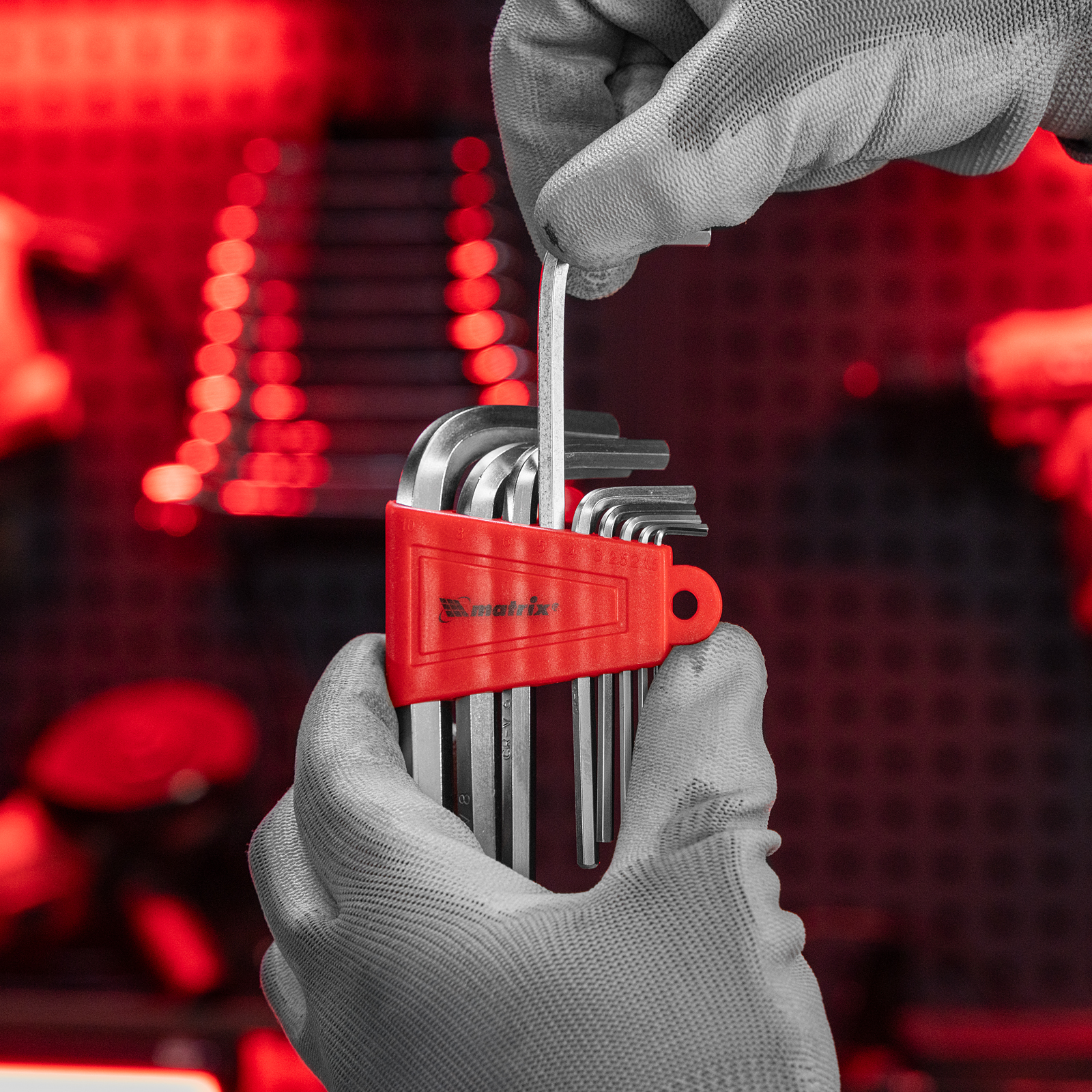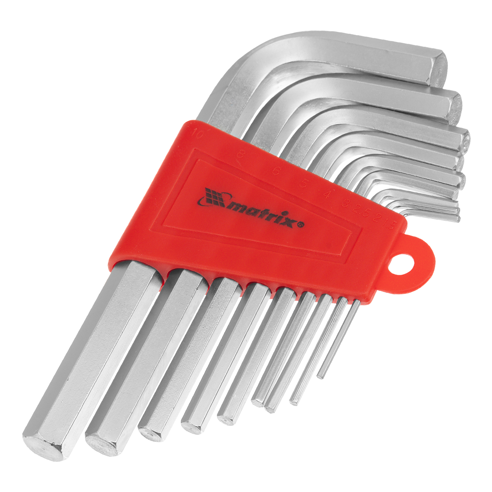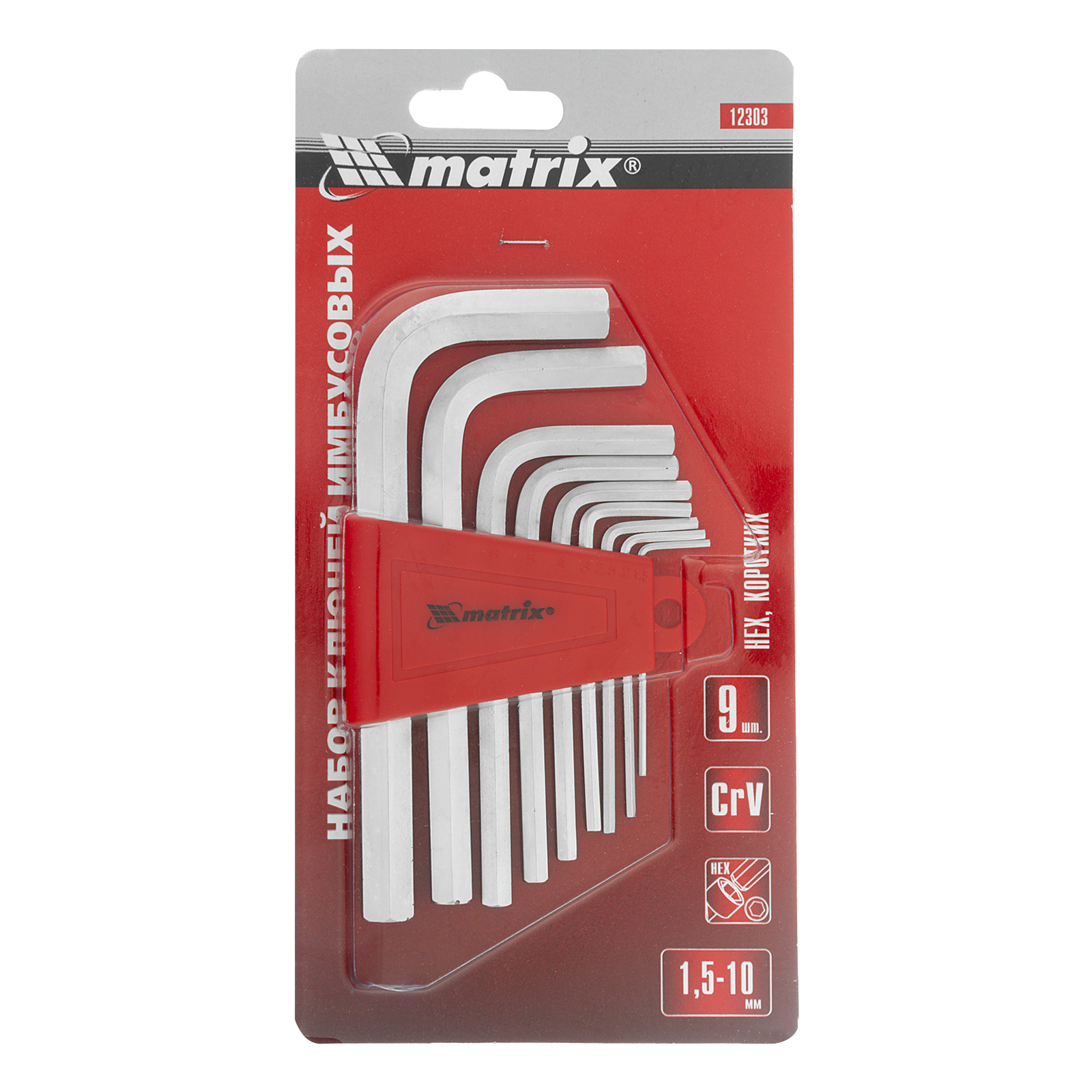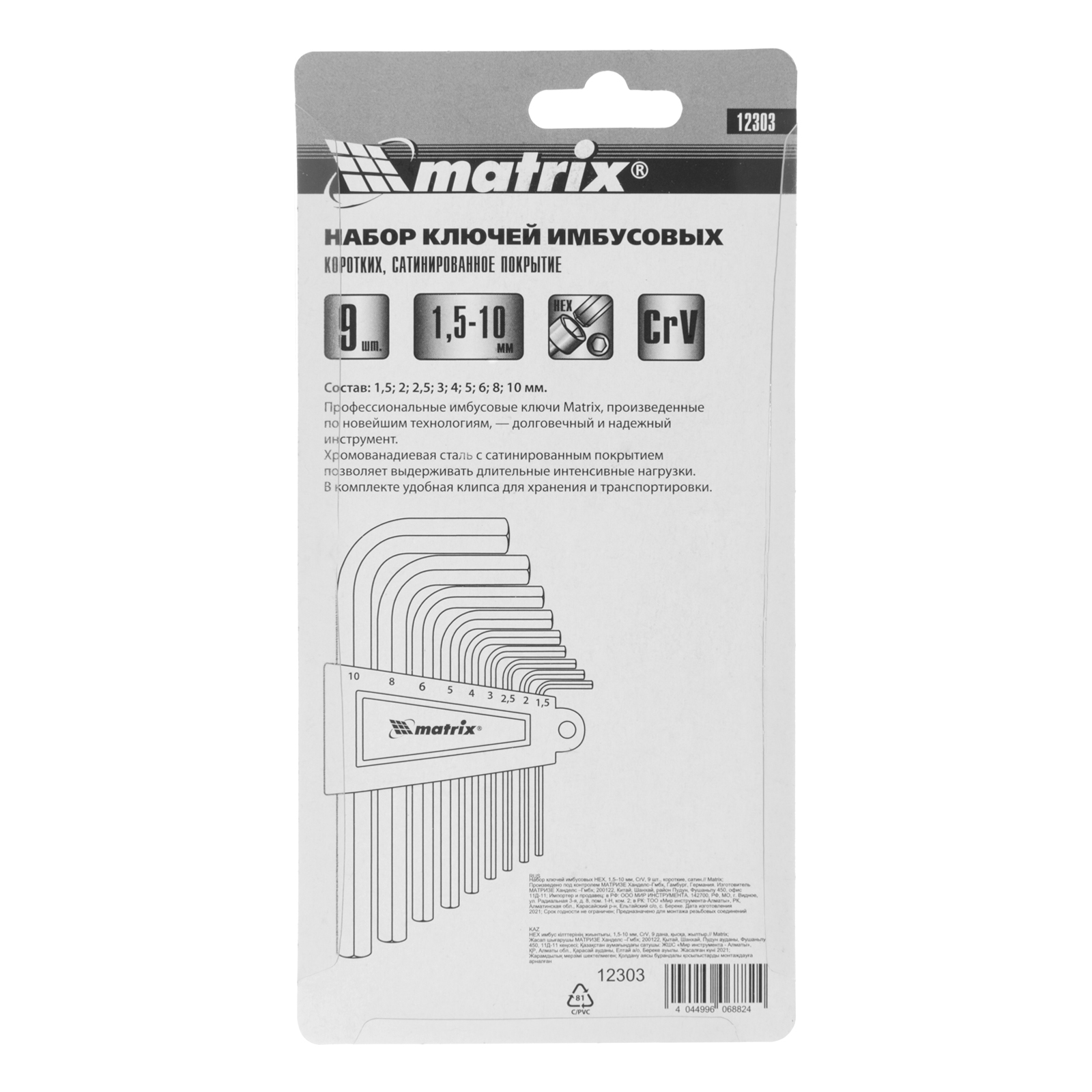 Набор коротких имбусовых ключей HEX Matrix 12303, 1,5-10 мм, сатинированный, 9 шт. из стали CrV, пригодится как начинающему мастеру, так и профессионалу. Ключи применяются при работе с крепежом, имеющим внутренний шестигранник. С их помощью можно собрать мебель или решить мелкие бытовые задачи. Короткие ключи удобны для работы в труднодоступных местах.