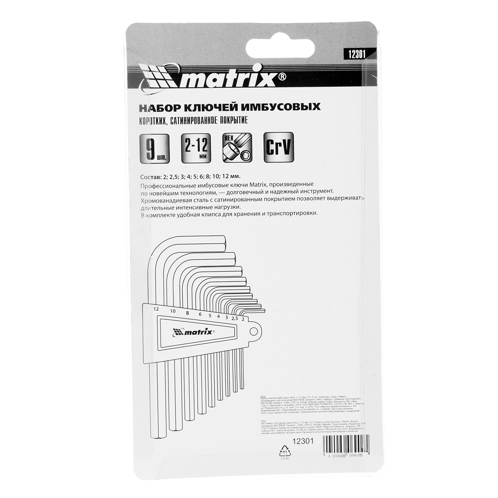 Набор коротких имбусовых ключей HEX Matrix 12301, 2-12 мм, сатинированный, 9 шт. из стали CrV, пригодится как начинающему мастеру, так и профессионалу. Ключи применяются при работе с крепежом, имеющим внутренний шестигранник. С их помощью можно собрать мебель или решить мелкие бытовые задачи. Короткие ключи удобны для работы в труднодоступных местах.