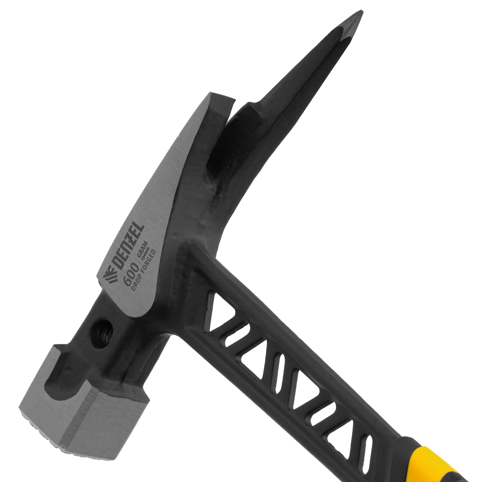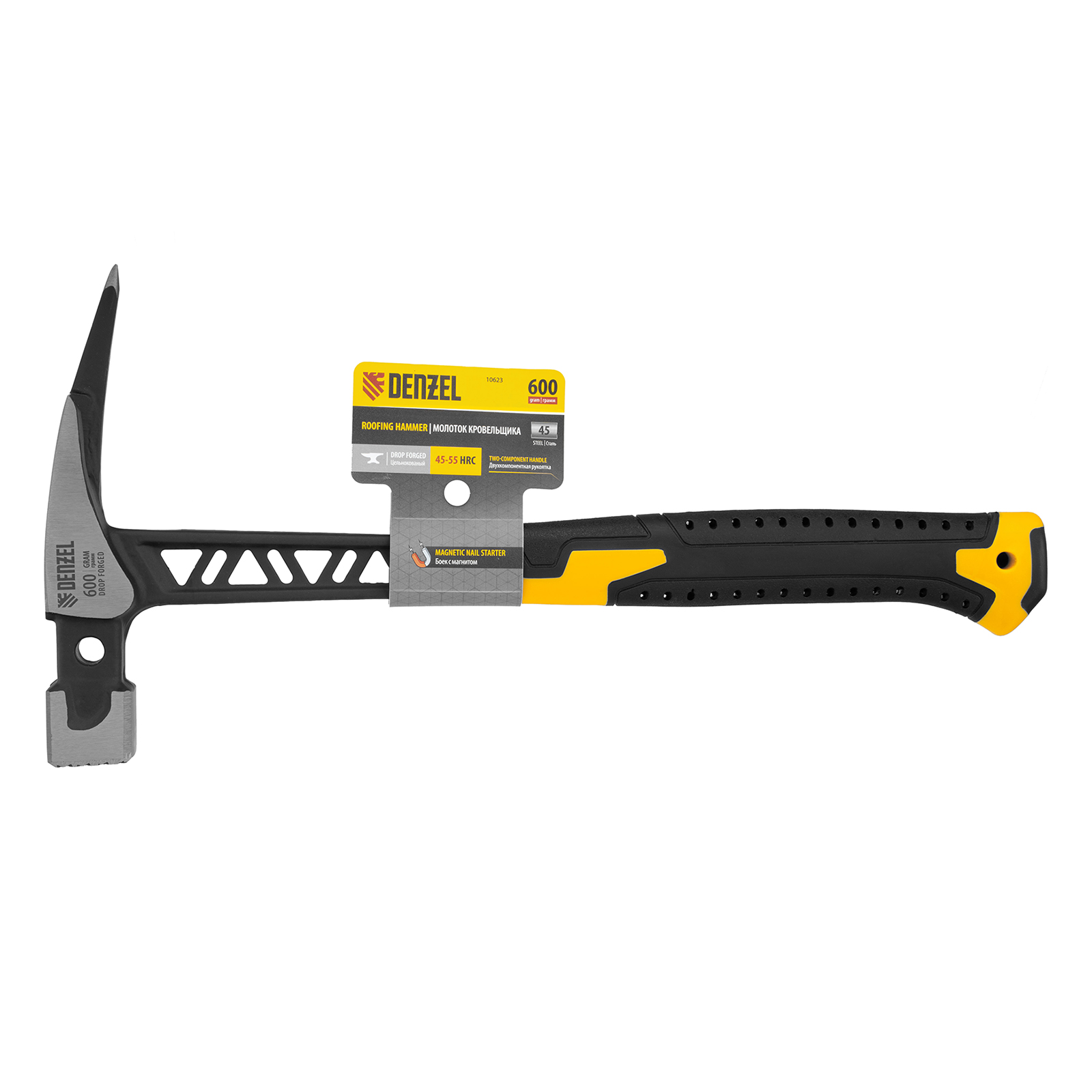 Цельнокованый молоток кровельщика Denzel 10623 с бойком весом 600 г, с магнитом и двухкомпонентной обрезиненной рукояткой, предназначен для проведения профессиональных кровельных работ. Благодаря особой конструкции позволяет проводить такие виды работ, как: выпрямление и извлечений гвоздей, пробивание отверстий в листовом металле, отгибание кромок. На рабочей поверхности бойка сделаны насечки для уменьшения риска соскальзывания при нанесении ударов по гвоздю.
