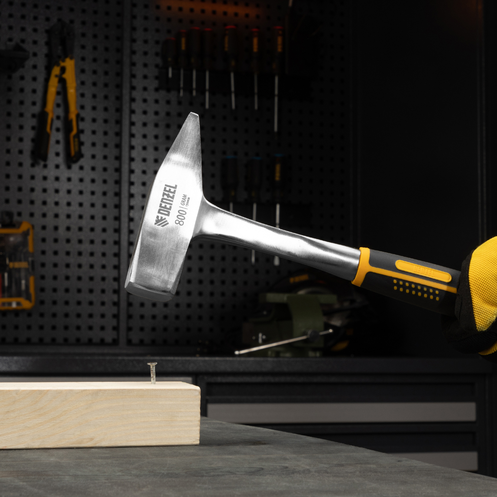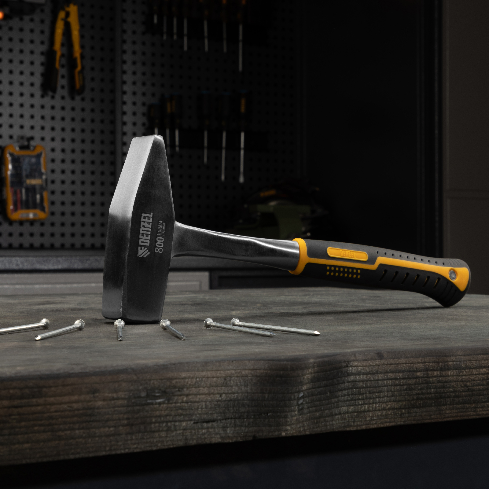 Цельнометаллический слесарный молоток Denzel 10405 с головкой весом 800 г и двухкомпонентной рукояткой предназначен для работы с металлическими заготовками, забивания гвоздей, штырей, дюбелей и других крепежных элементов. Необходим во время строительства, ремонта, сборки и установки мебели, также пригодится дома, на даче и в гараже. Инструмент рекомендован для профессионального и домашнего применения.