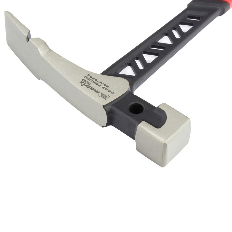 Цельнокованый молоток каменщика Matrix PRO 10632 с головкой весом 680 г и двухкомпонентной обрезиненной рукояткой используется для работ с каменной или кирпичной кладкой. Квадратный боек предназначен для нанесения ударов, а удлиненный заточенный носок — для разрубания камня или кирпича. Гвоздодер применяется для выпрямления небольших гвоздей.