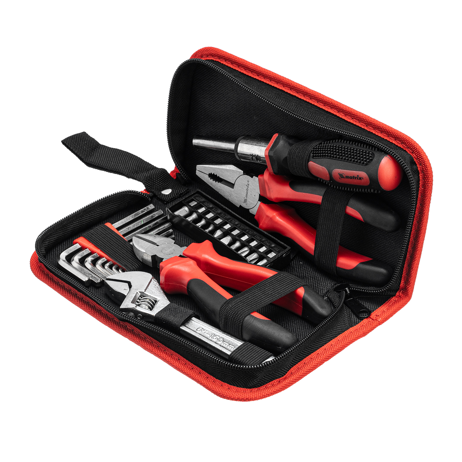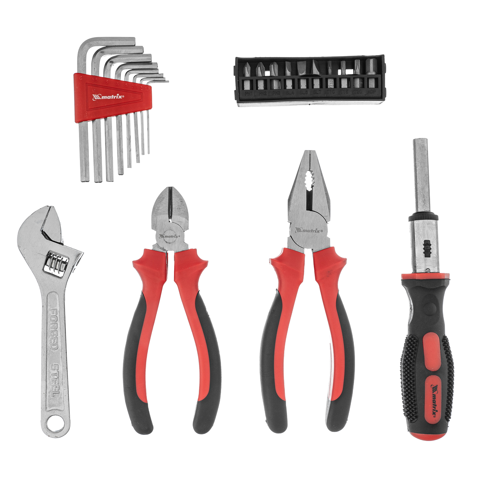 Слесарно-монтажный набор Matrix 13561, 22 предмета, оптимально подходит для бытового и профессионального использования. Универсальный набор содержит ключи-шестигранники для удобства работы в труднодоступных местах, разводной ключ для монтажа/демонтажа болтов и гаек, реверсивную отвертку с битами и переходником для работы с крепежными элементами, бокорезы и плоскогубцы для зажима и сгибания заготовок.