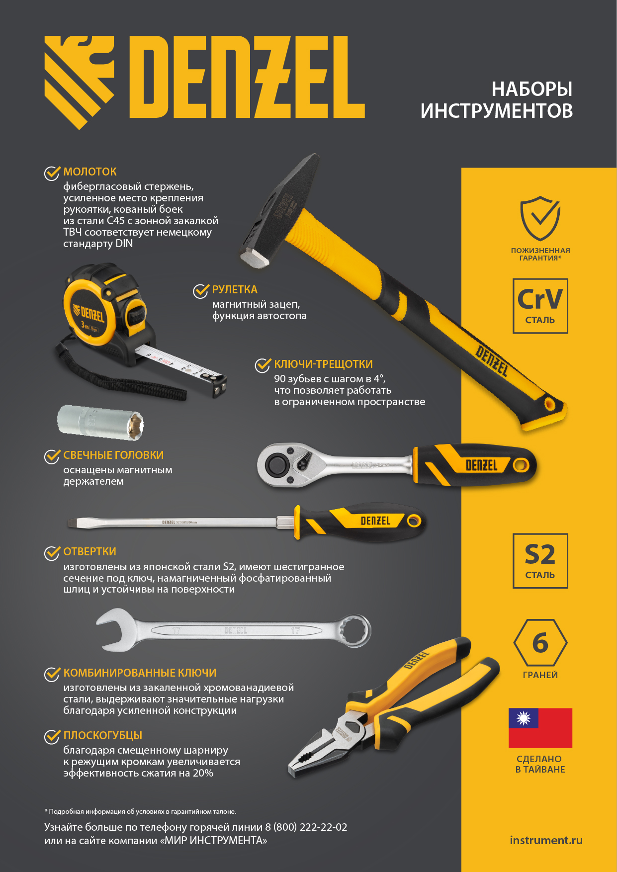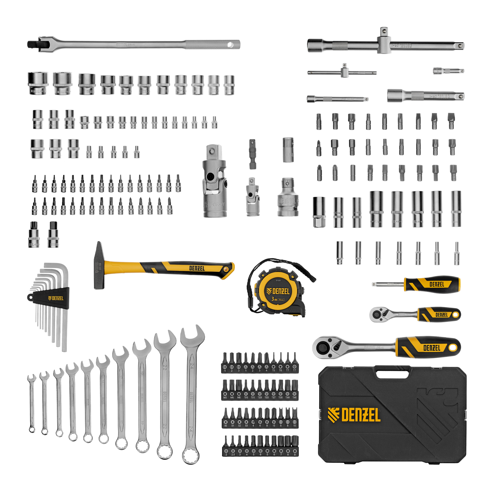 Набор инструментов Denzel 15806 состоит из 194 предметов с присоединительными квадратами 1/4″ и 1/2″, упакованных во вместительный ударопрочный кейс собственной разработки с антивандальным покрытием. В комплект поставки входят инструменты и оснастка для монтажа и демонтажа резьбовых соединений, а также молоток для выполнения ударных работ, рулетка для проведения измерений и нож для резки материалов. Набор предназначен для профессионального использования в автомастерской, будет полезен и для решения бытовых вопросов.