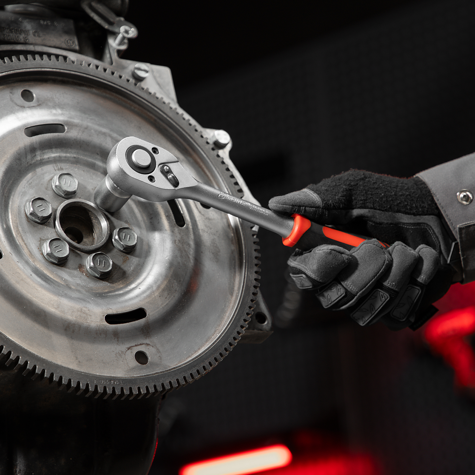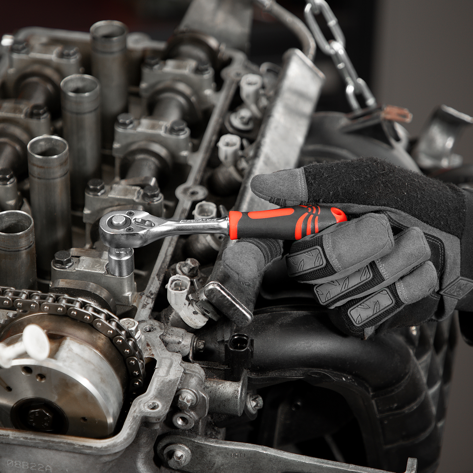 - Удобная работа в ограниченном пространстве — шаг трещоток с 48 зубьями составляет 7,5°, удлинители обеспечивают доступ к глубоко расположенному крепежу.