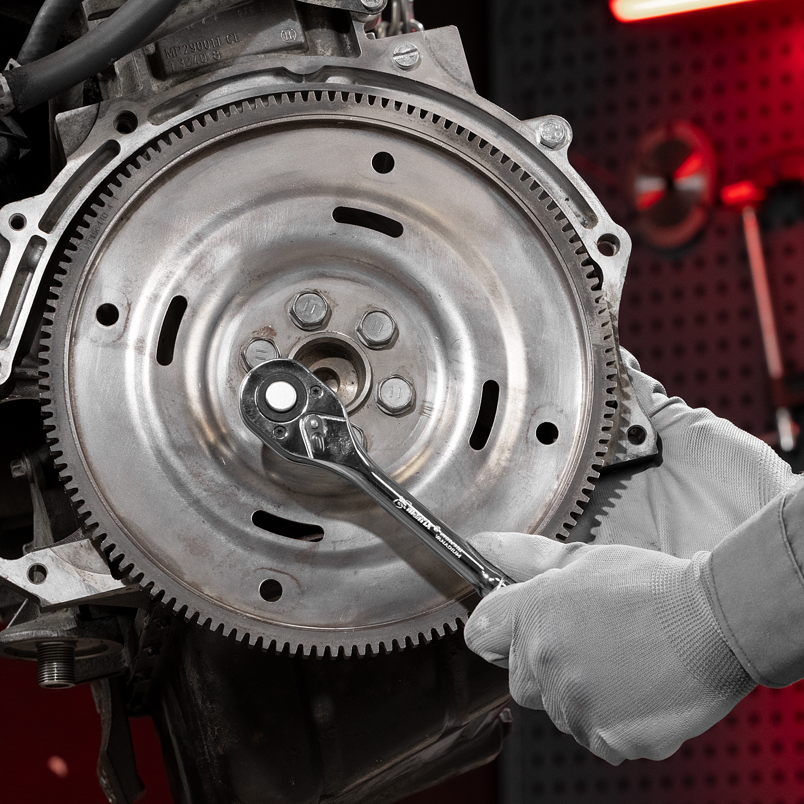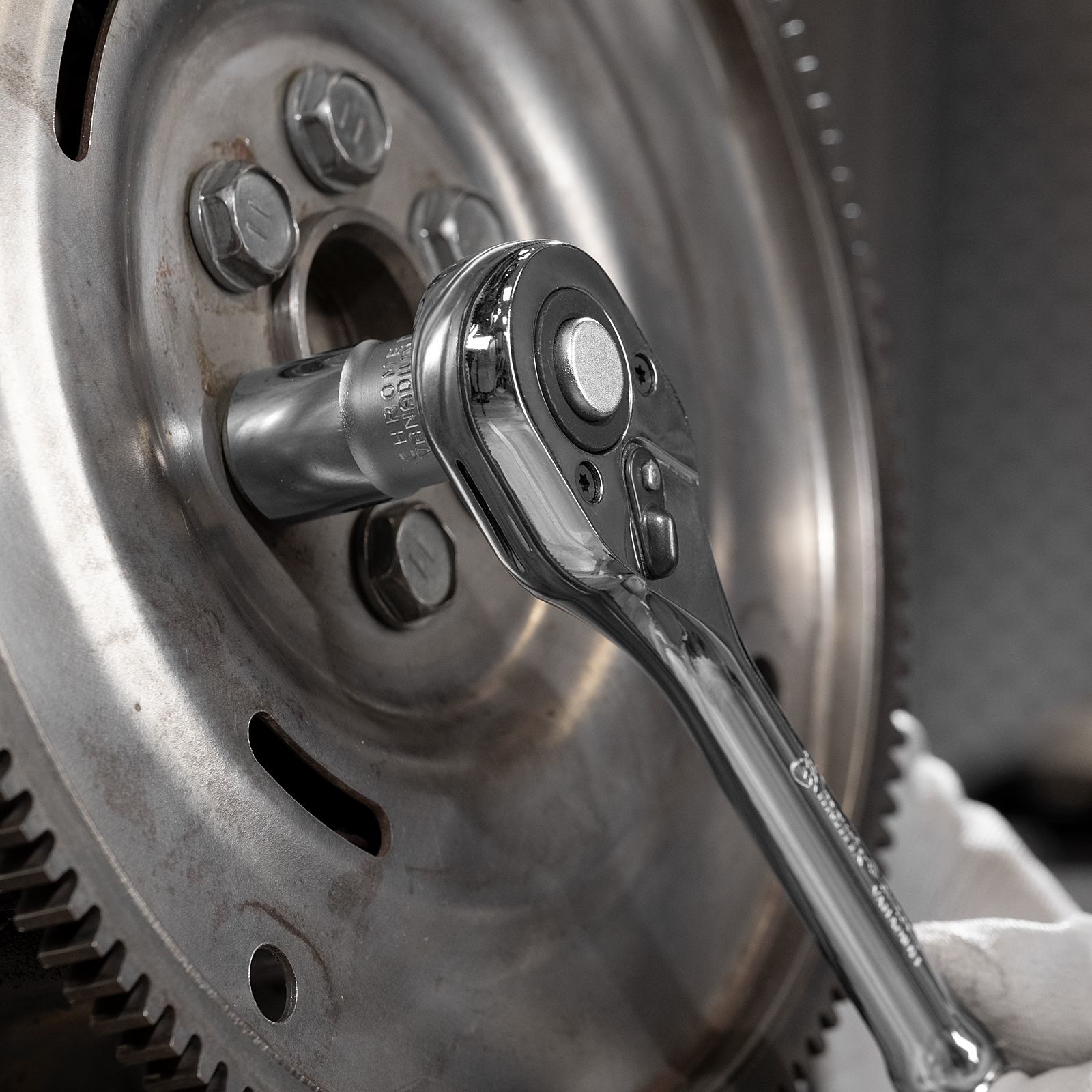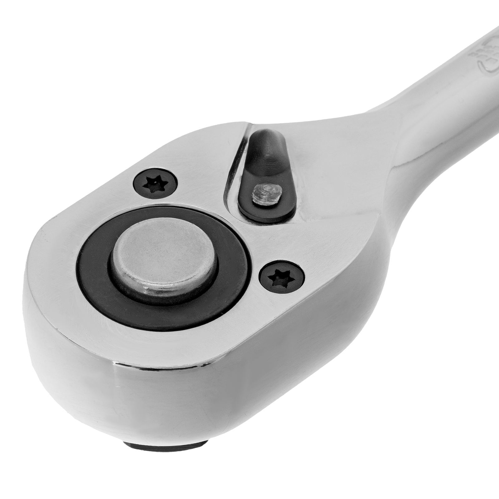 - Реверс — благодаря специальному переключателю ключ-трещотка может использоваться и для закручивания, и для откручивания крепежей.