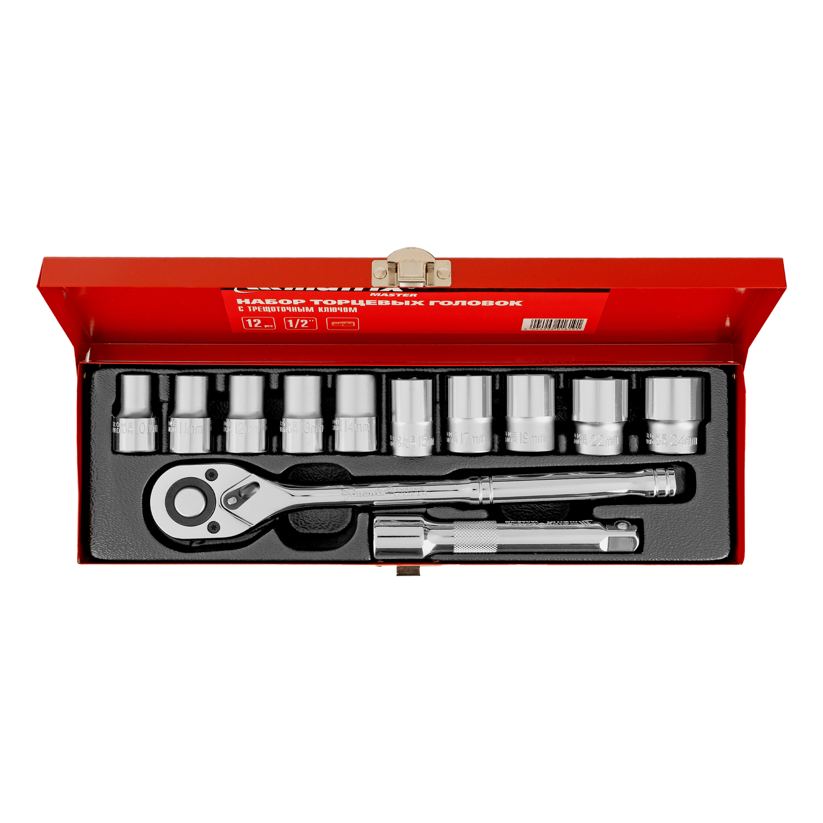 Набор торцевых головок Matrix 13526 включает в себя торцевые головки размером 10-24 мм с присоединительным квадратом 1/2", трещоточный ключ и удлинитель 125 мм. Инструменты служат для работы с резьбовыми соединениями и будут полезны как дома, так и в автомастерской.