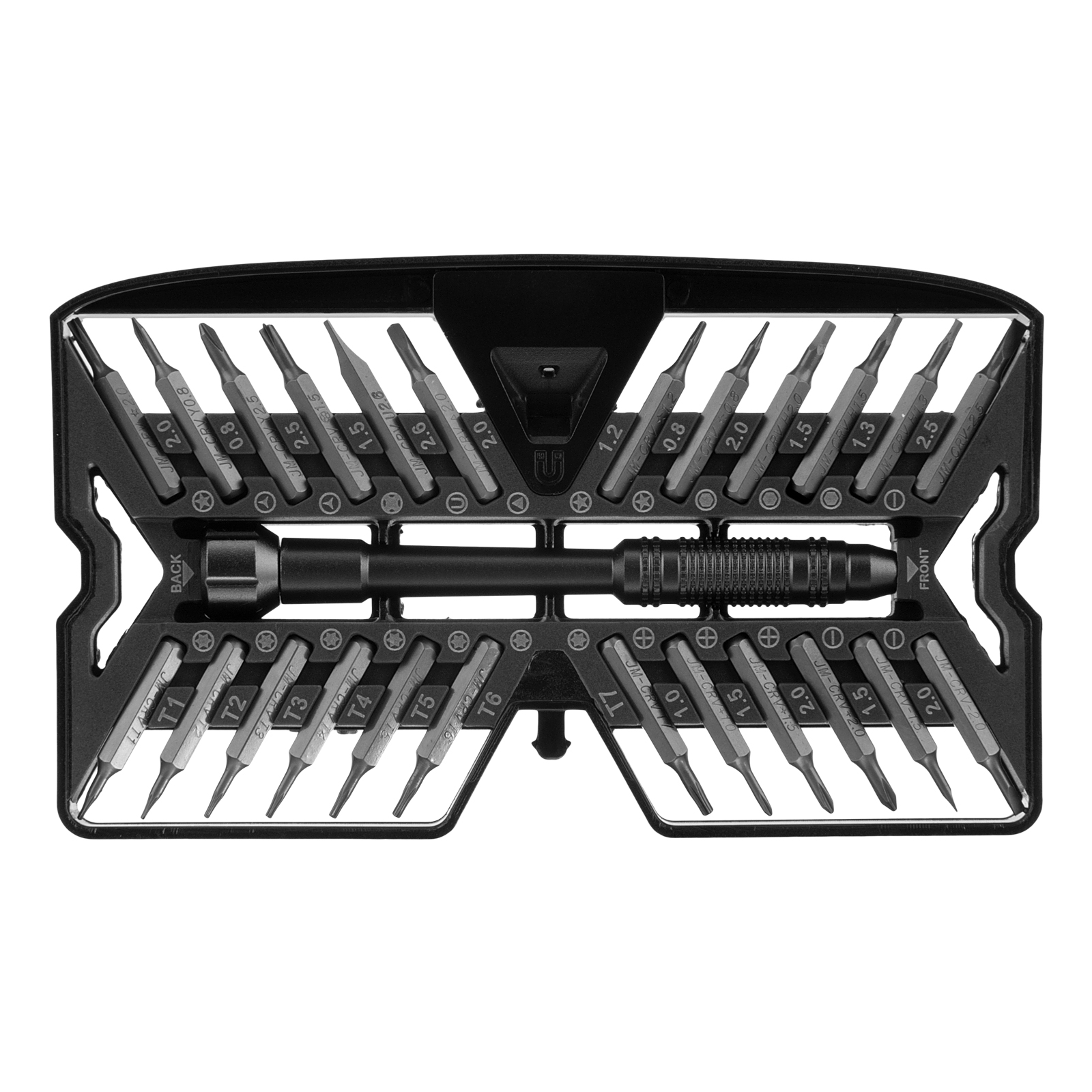 Набор для точных работ 26 в 1 Matrix 13567 содержит 24 биты с наконечниками PH, SL,T, H, Str, Y, St, TR, U, отвертку и пластиковый кейс. С его помощью можно отремонтировать очки, игрушки, портативную и бытовую технику и т.д.