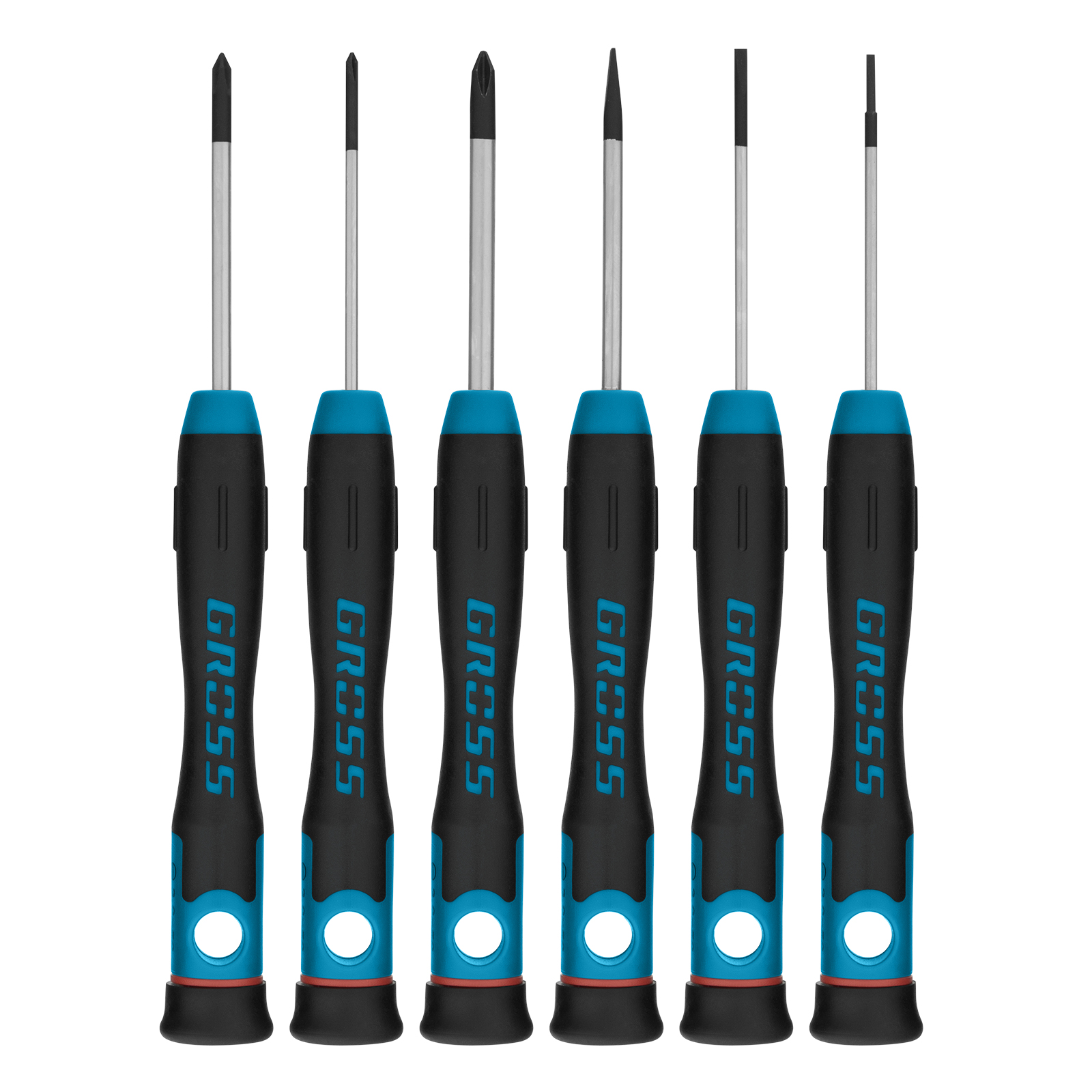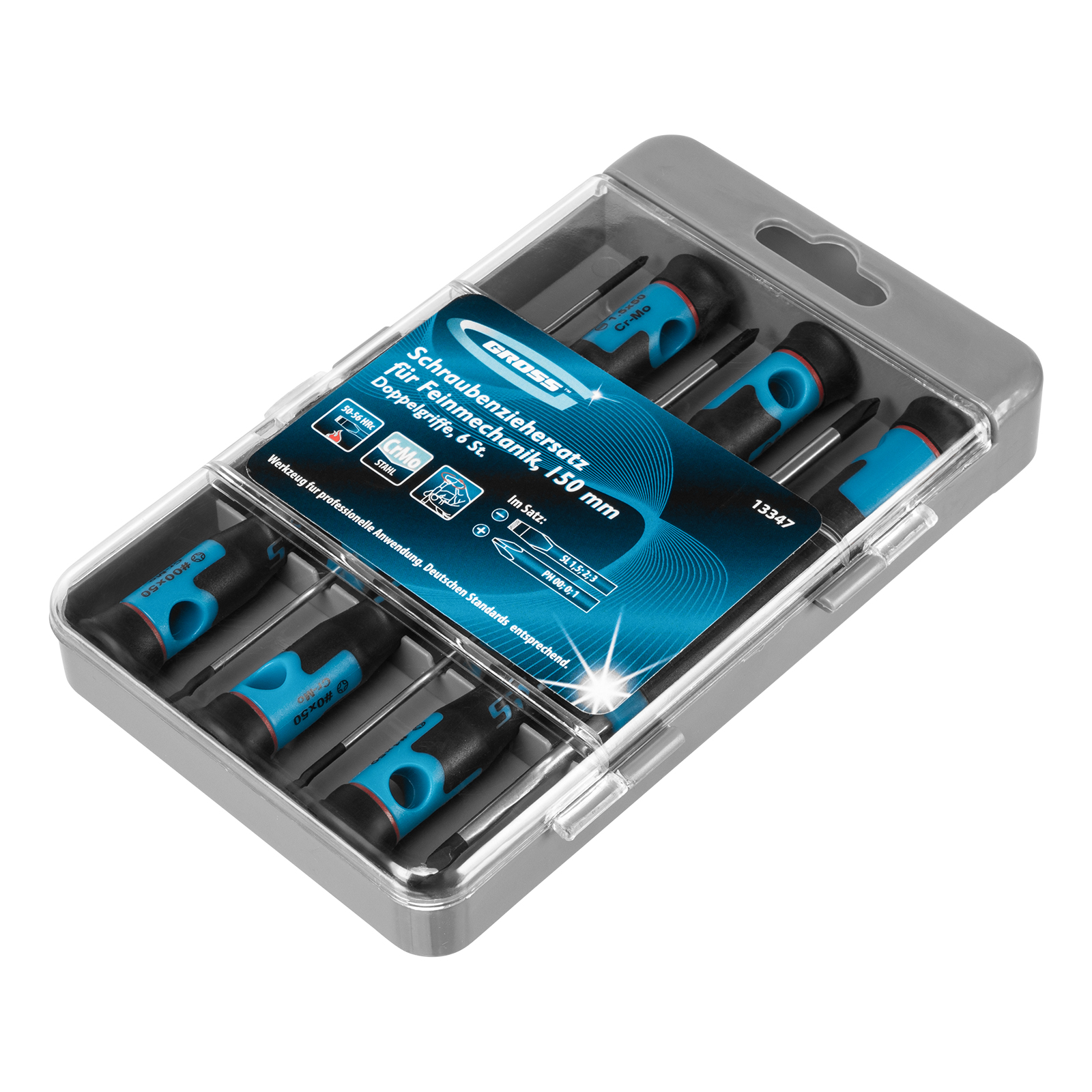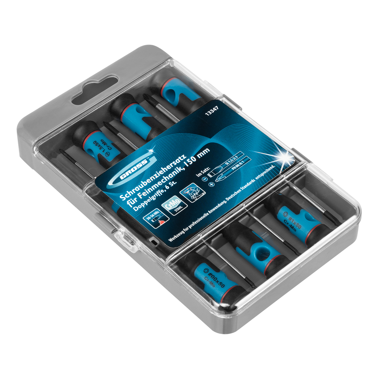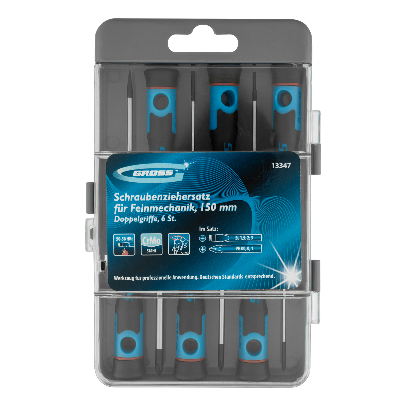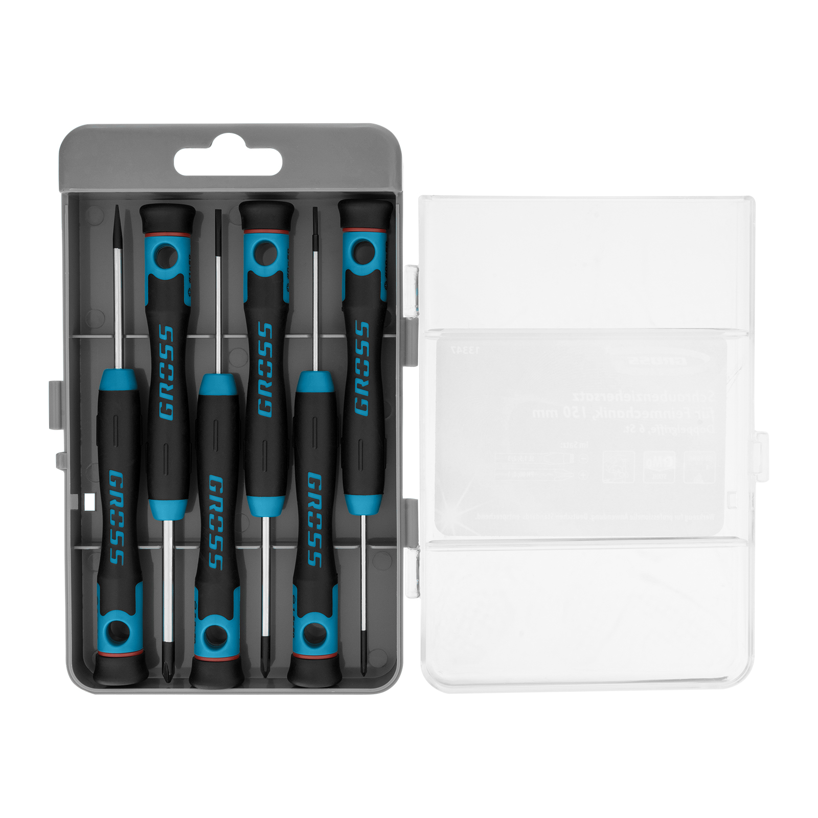 Набор отверток для точной механики Gross 13347, CrMo, с двухкомпонентными рукоятками, в пластиковом боксе, позволяет проводить работы с мелкими винтами при ремонте бытовой техники, часовых механизмов и т.д. Отвертки рассчитаны на монтаж/демонтаж крепежа типоразмера SL и PH. Профессиональный набор пригодится при решении сложных задач с интенсивными нагрузками.