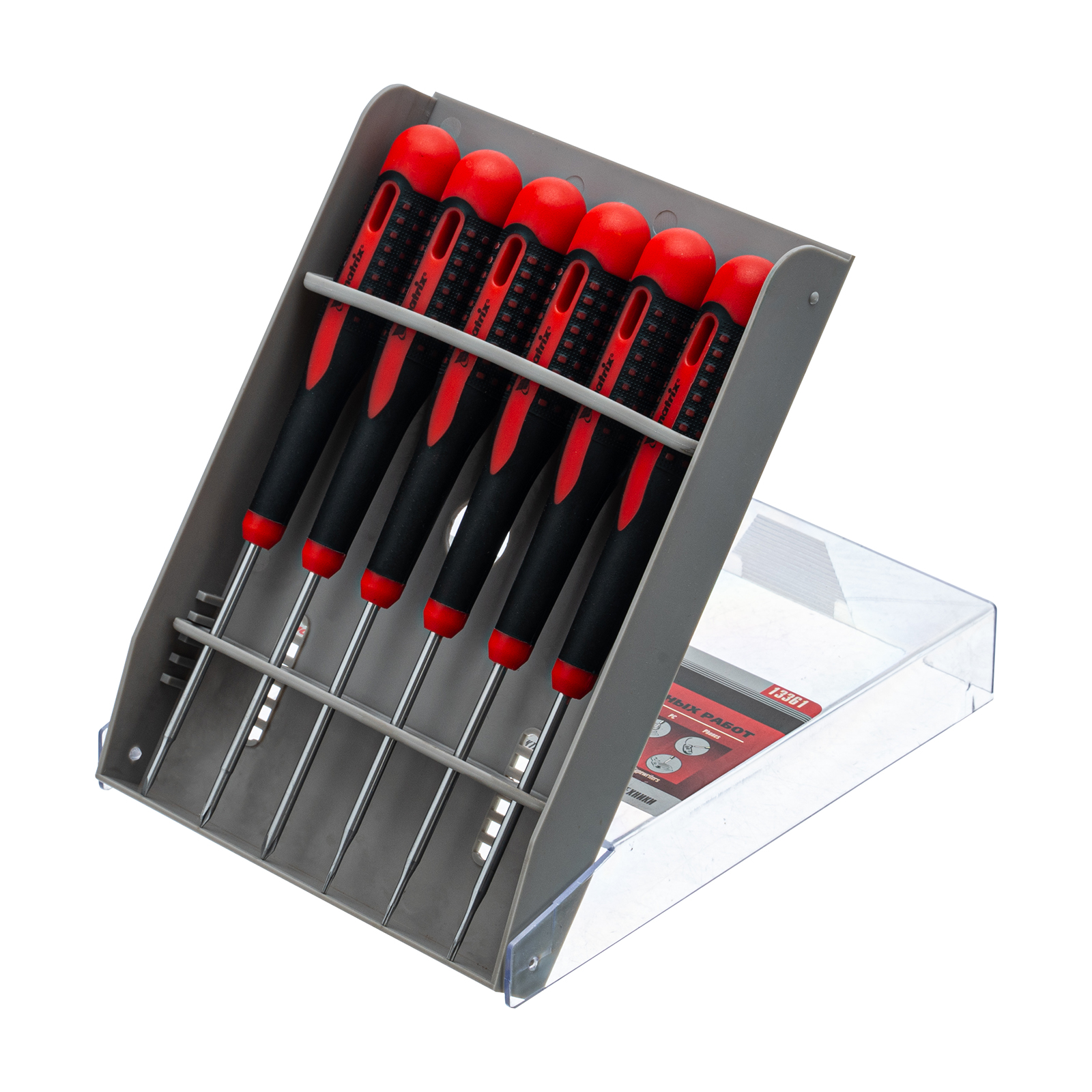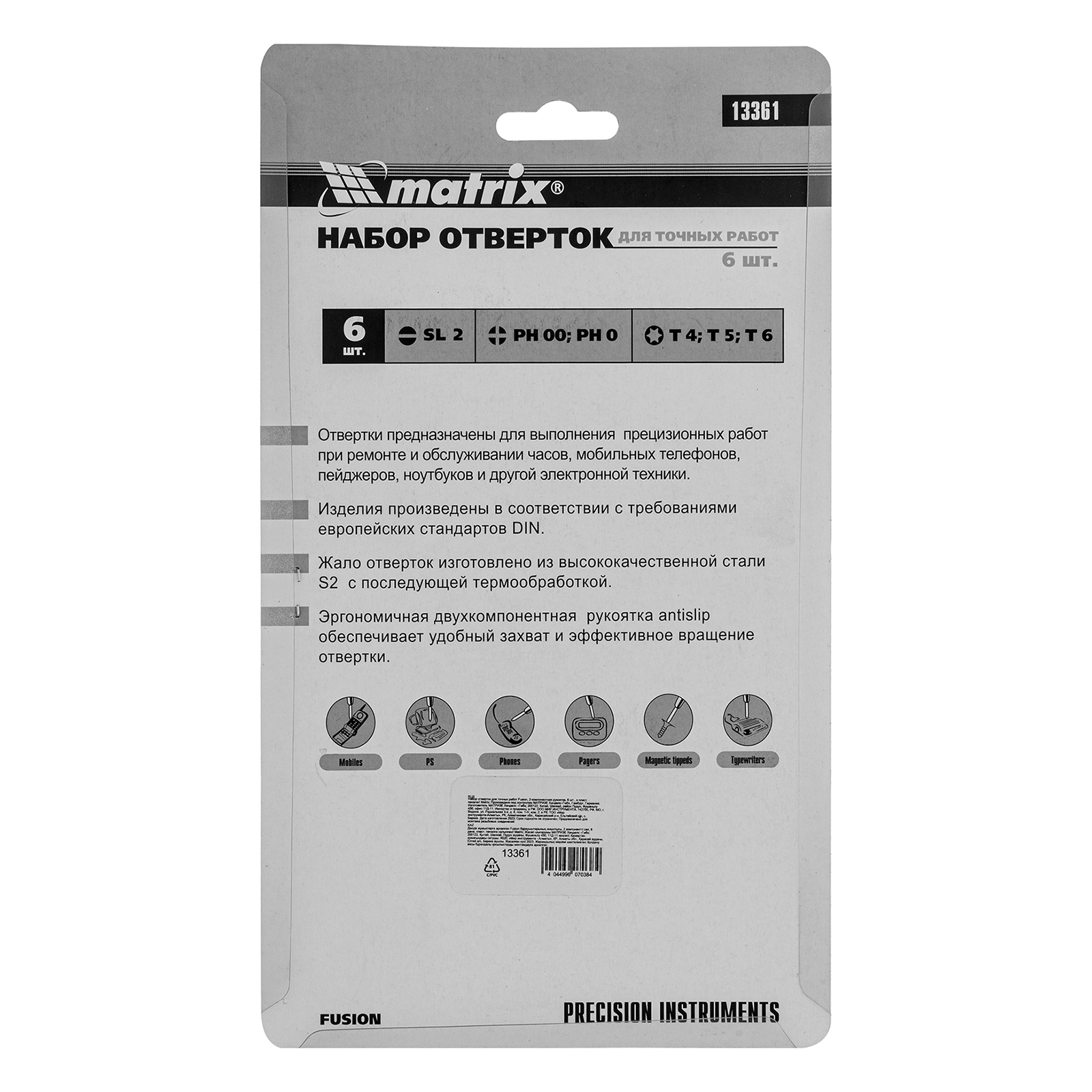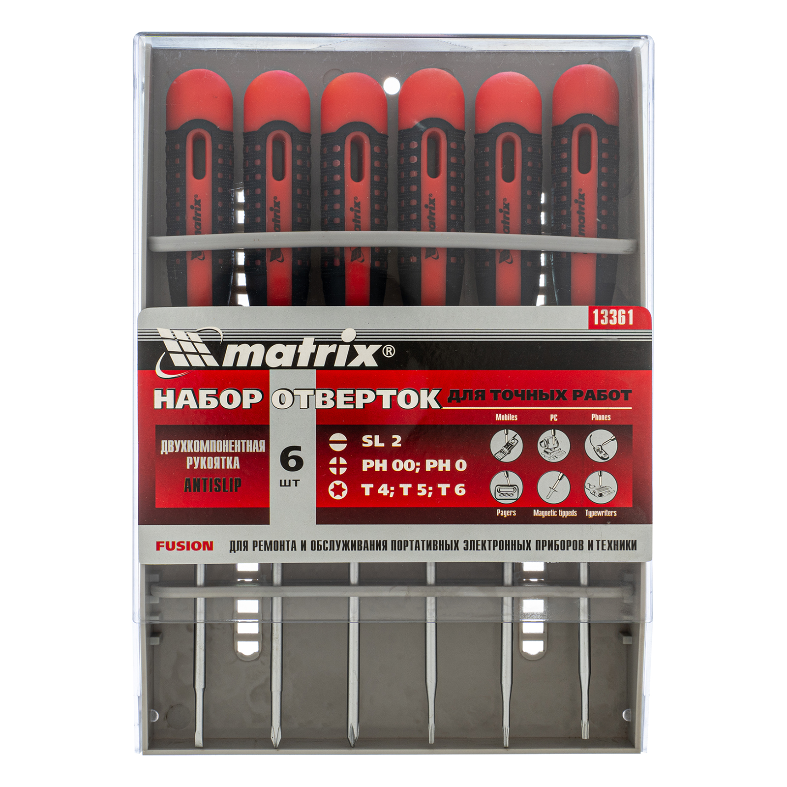 Набор отверток для точных работ Matrix Fusion 13361 c двухкомпонентными рукоятками состоит из 6 инструментов, упакованных в пластиковый пенал, и предназначен для проведения обслуживания и ремонта портативной техники. Отвертки подходят для крепежных элементов со шлицами PH, SL и Torx. Набор пригодится как профессионалам, так и домашним умельцам.
