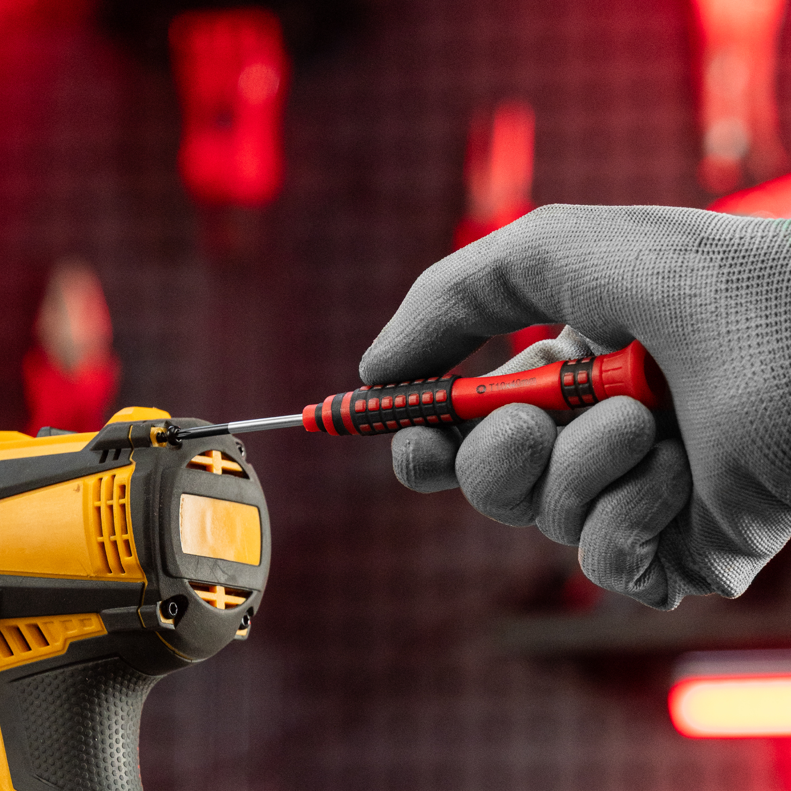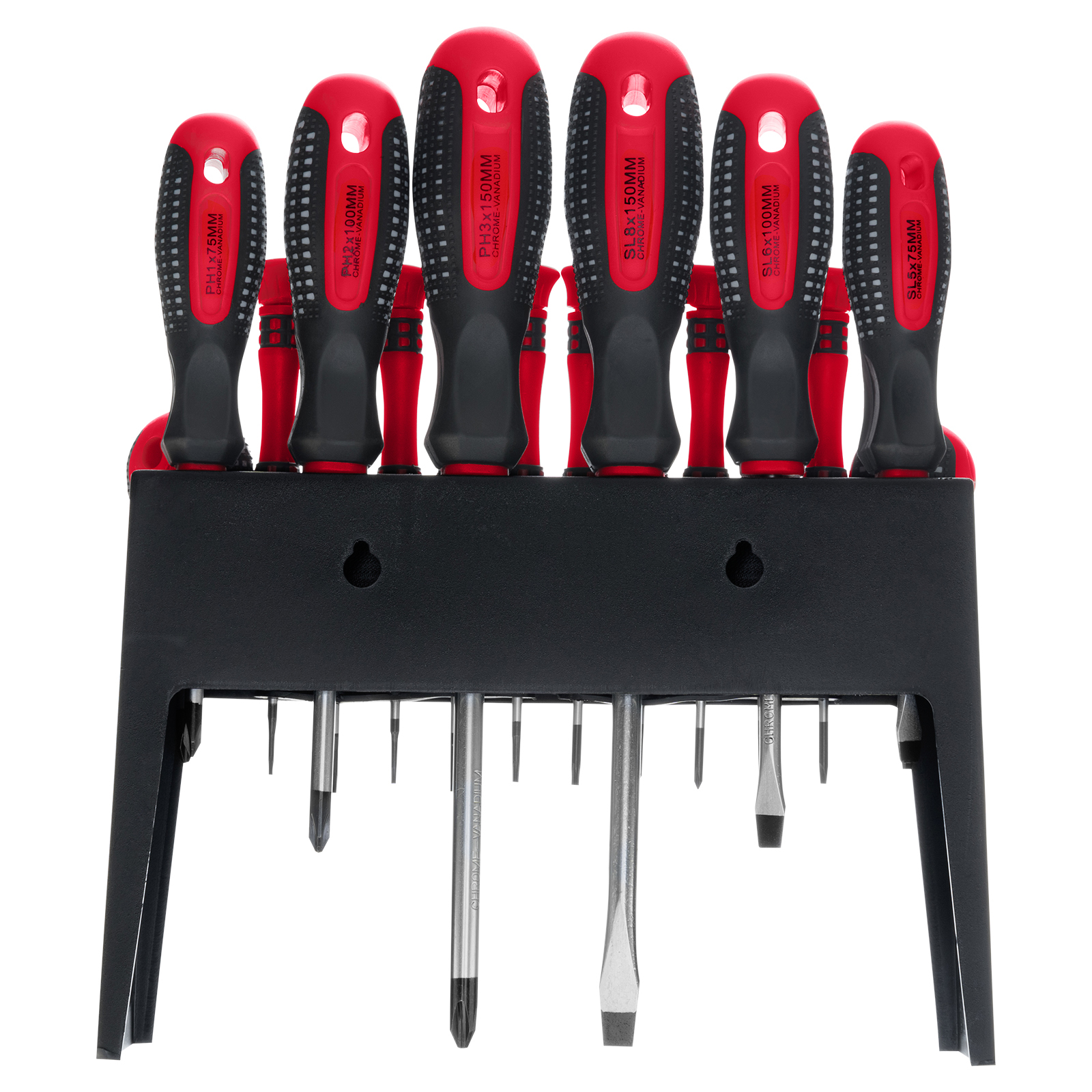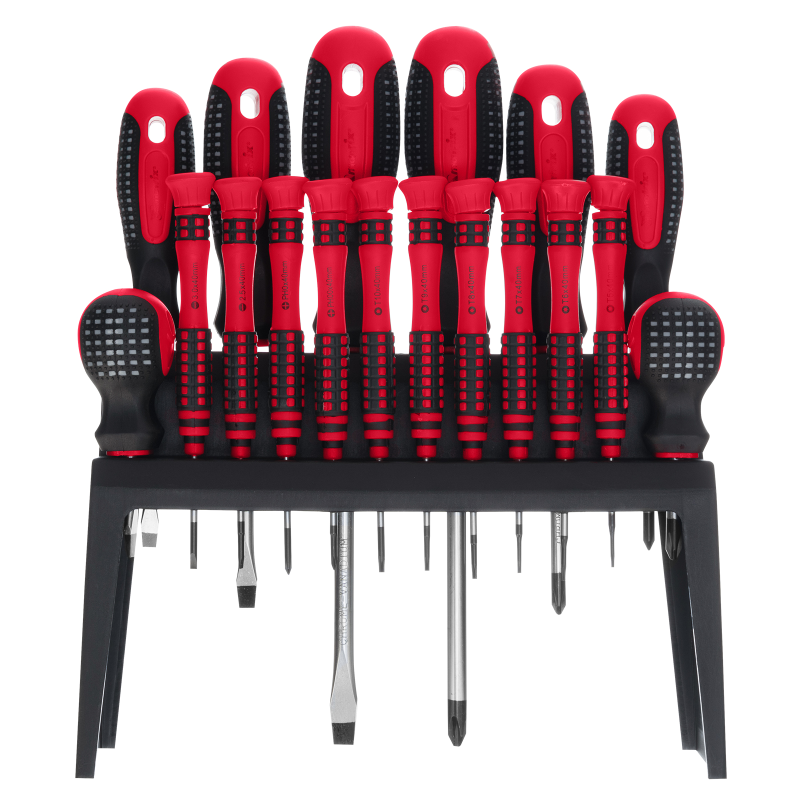 - Удобное хранение — отвертки размещаются на пластиковой подставке, которую можно поставить на стол или повесить на стену.