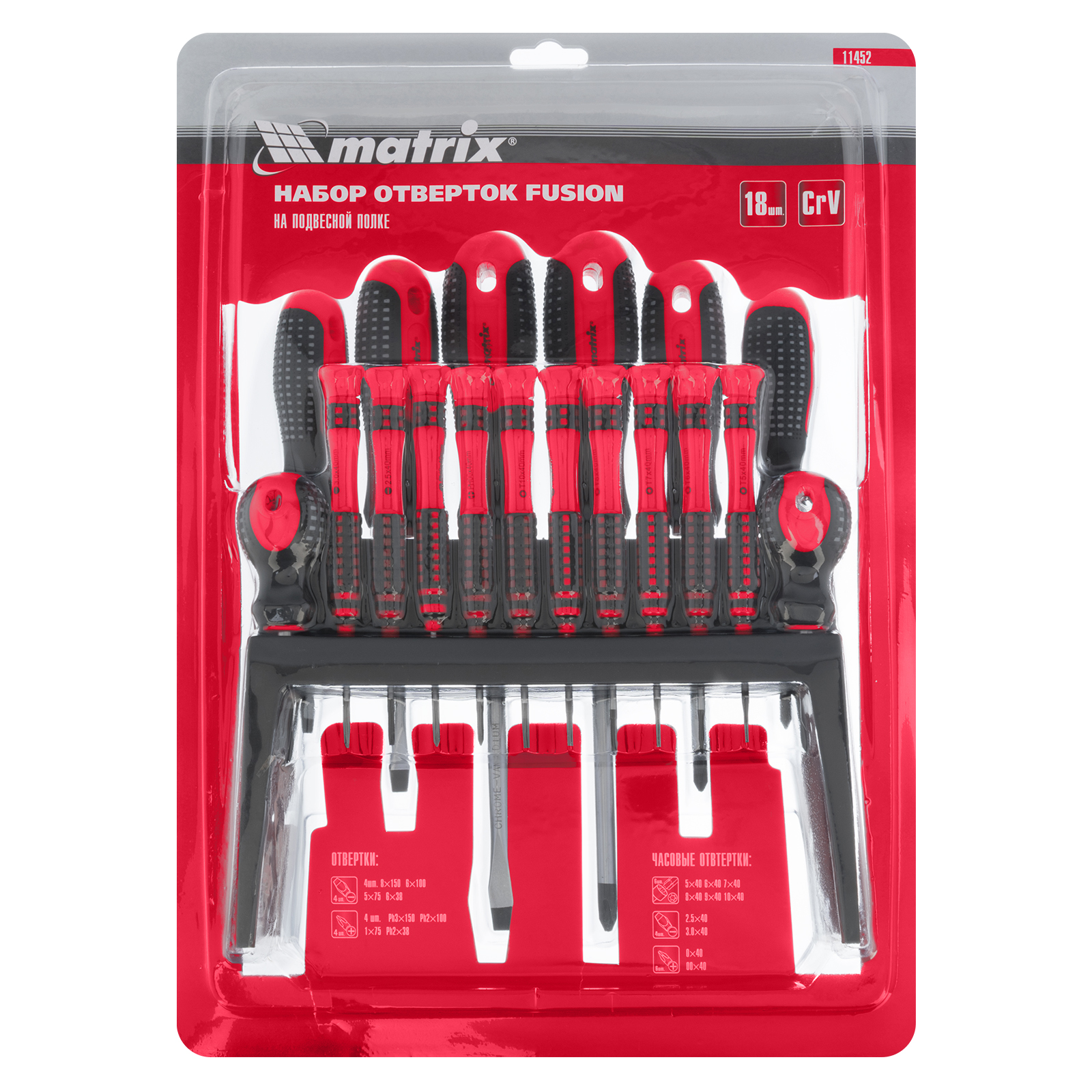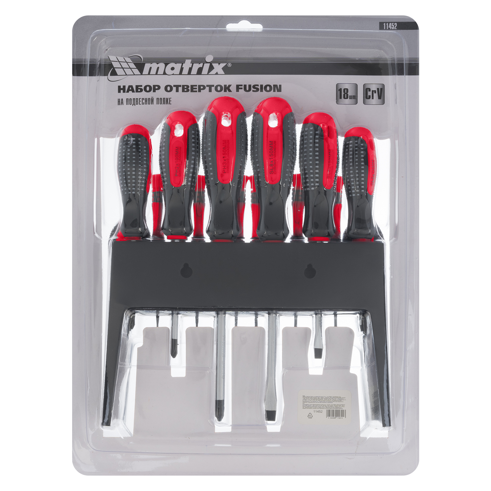 Набор отверток Matrix Fusion 11452 включает 18 инструментов из стали CrV на подвесной полке и предназначен для закручивания и откручивания резьбовых крепежей со шлицами PH, SL и Torx. В комплекте стандартные и прецизионные отвертки для выполнения работ любой сложности. Набор будет полезен во время сборки и установки мебели, а также при проведении ремонта бытовой, компьютерной и мобильной техники.