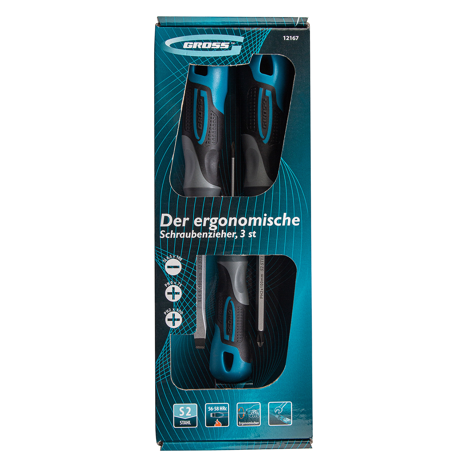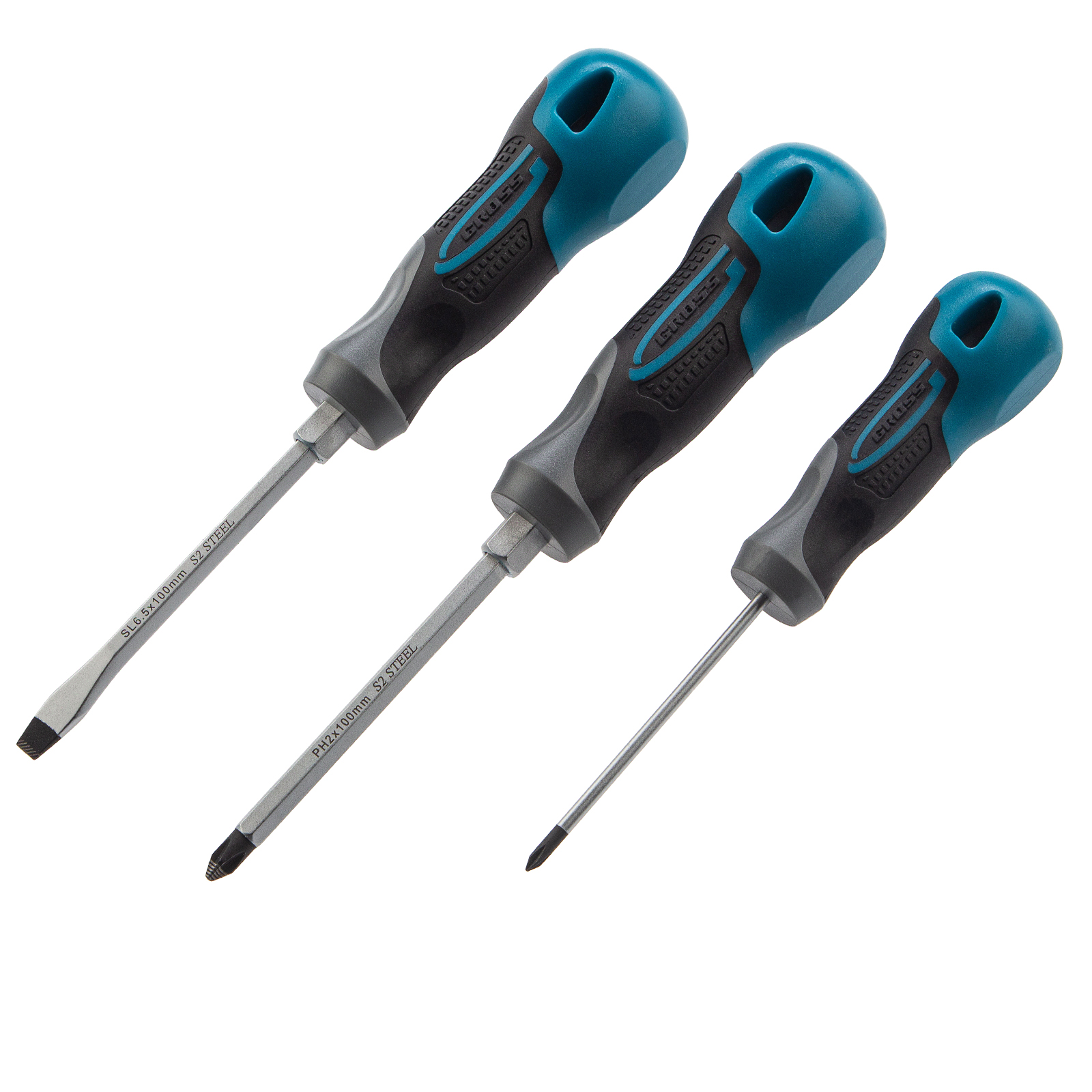 Комбинированный набор Gross 12167 включает 3 отвертки из стали S2, с трехкомпонентными рукоятками, позволяющих осуществлять монтаж/демонтаж крепежных элементов типа Philips и Slotted. Он используется для решения профессиональных задач при проведении строительных, ремонтных и монтажных работ. Длина стержней отверток составляет 75-100 мм, поэтому набор оптимален для работы с легкодоступными резьбовыми соединениями.